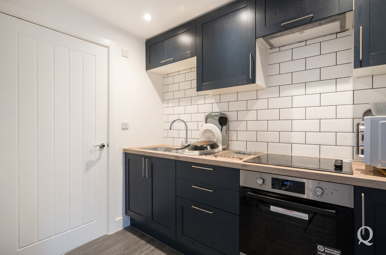 The accommodation comprises a welcoming entrance leading into a bright open-plan living space, incorporating a comfortable lounge area and a modern fitted kitchen with sleek cabinetry, work surfaces and integrated cooking appliances.