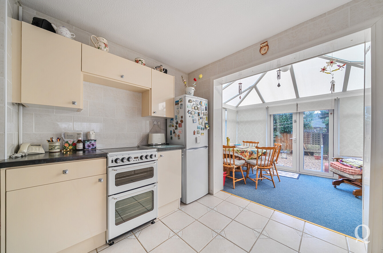 The property features a fitted kitchen with a range of wall and base units, work surfaces and appliance space, which in turn opens into a bright conservatory overlooking the rear garden—an excellent additional reception space suitable for dining or relaxation.