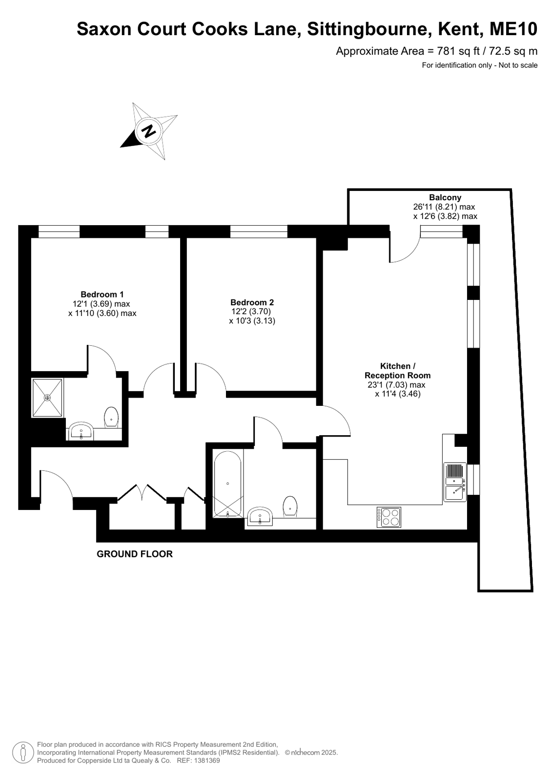A well-presented and spacious two-bedroom ground floor apartment, set within the desirable Saxon Court development on Cooks Lane, Sittingbourne. Offering approximately 781 sq ft of accommodation, this modern home benefits from an open-plan layout, generous room sizes, and a superb private balcony, creating an ideal space for both comfortable living and entertaining. The property opens into a welcoming entrance hall with useful storage, leading through to the impressive open-plan kitchen/reception room. This bright and versatile space provides ample room for both dining and relaxing, with the kitchen area thoughtfully arranged and complete with integrated appliances. A single door lead directly onto a large private balcony, perfect for enjoying outdoor dining, morning coffee, or simply relaxing in a peaceful setting. There are two well-proportioned double bedrooms, both positioned off the hallway. The principal bedroom benefits from its own en-suite shower room, while the second bedroom is served by a modern family bathroom located conveniently nearby. The apartment is in very good order throughout, offering contemporary fittings, clean lines, and a well-planned layout that makes excellent use of the available space. Positioned on the ground floor, it may appeal to a wide range of buyers. A stylish and comfortable home in a sought-after location, ideally placed for access to Sittingbourne’s amenities and transport links.