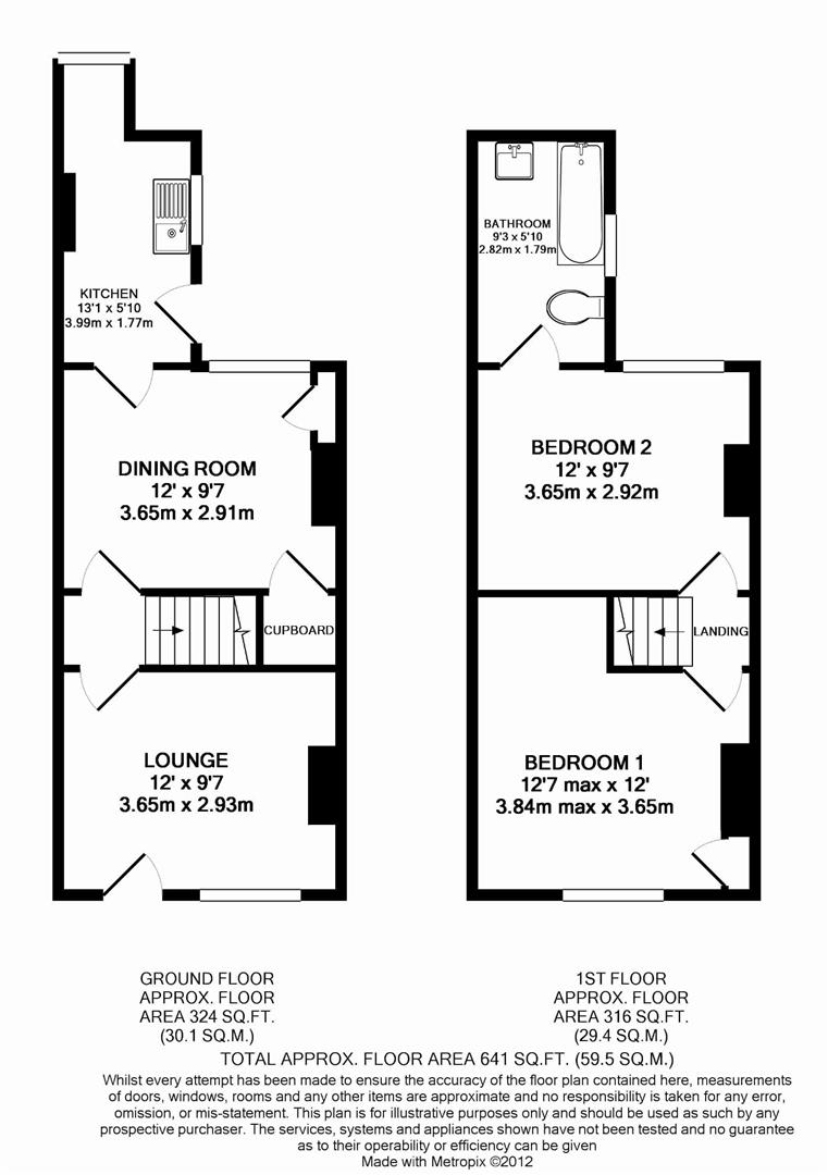 This well-proportioned two-bedroom terraced house offers a practical and well-balanced layout across two floors, making it an excellent choice for first-time buyers, small families, or investors. The ground floor features a bright and comfortable lounge to the front, leading through to a spacious dining room, ideal for both everyday living and entertaining. A useful cupboard within the dining area provides excellent under-stairs storage. Leading through to the rear, the fitted kitchen offers a functional workspace with good storage, providing access to the rear garden. Upstairs, the property comprises two generous double bedrooms. The second bedroom provides access to the family bathroom, which is fitted with a bath and overhead shower. The principal bedroom is particularly spacious, offering excellent proportions for larger furniture. The property extends to approximately 641 sq. ft. in total and benefits from a good sense of space and natural light throughout. Well located, this home presents a great opportunity for buyers looking to move straight in while still offering scope to personalise.