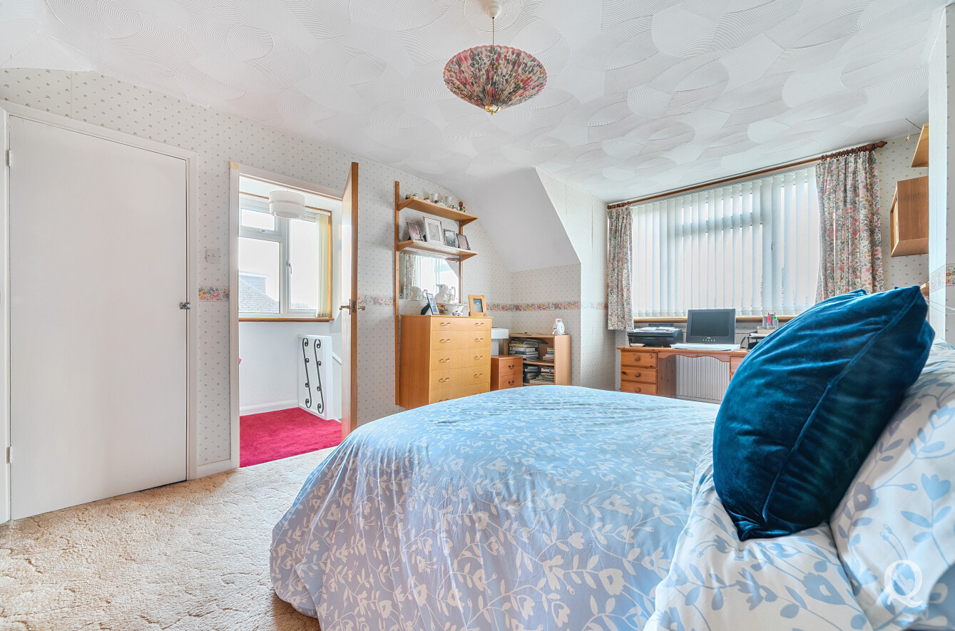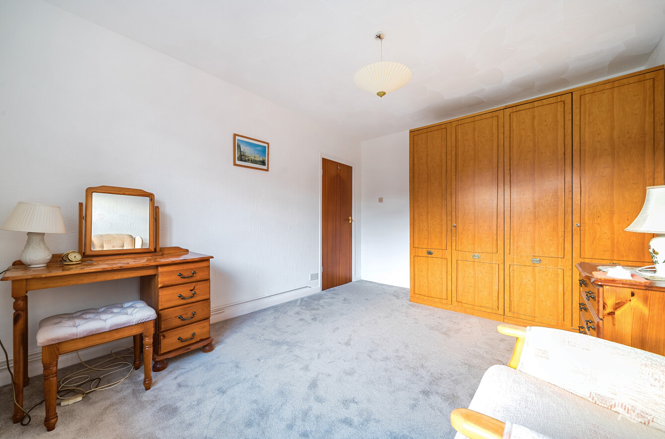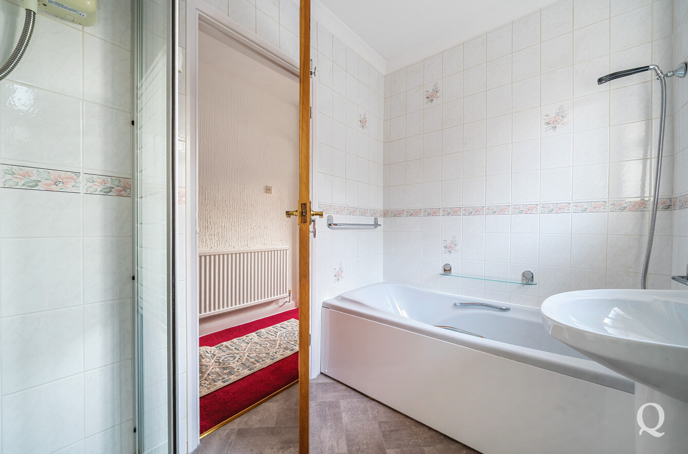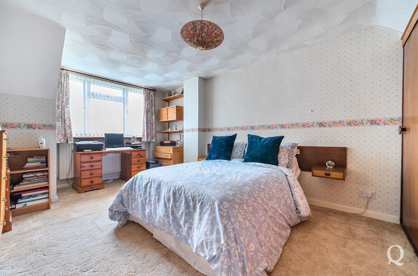 Upstairs, the main bedroom occupies the entire first floor and enjoys a bright and open feel. Outside, the property benefits from a private rear garden and a detached garage. The home requires full modernisation, but its layout and proportions provide a solid starting point for a personalised and well-finished renovation.