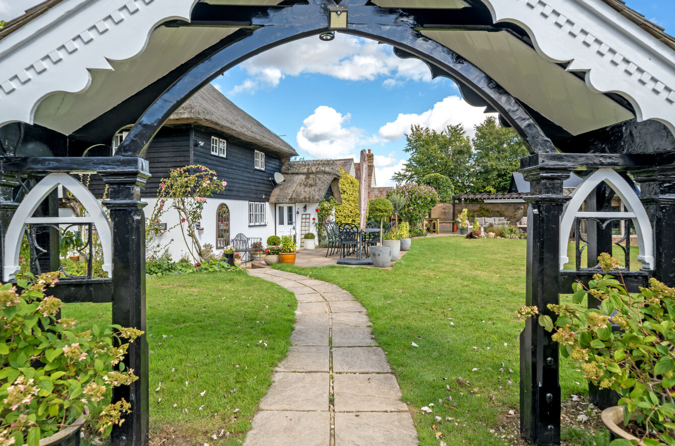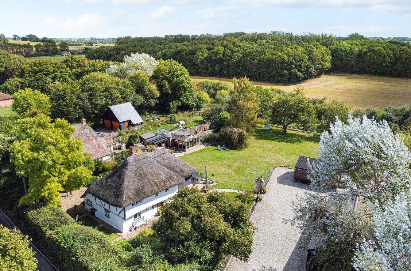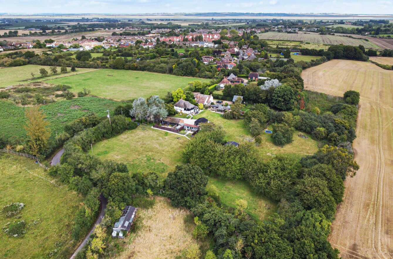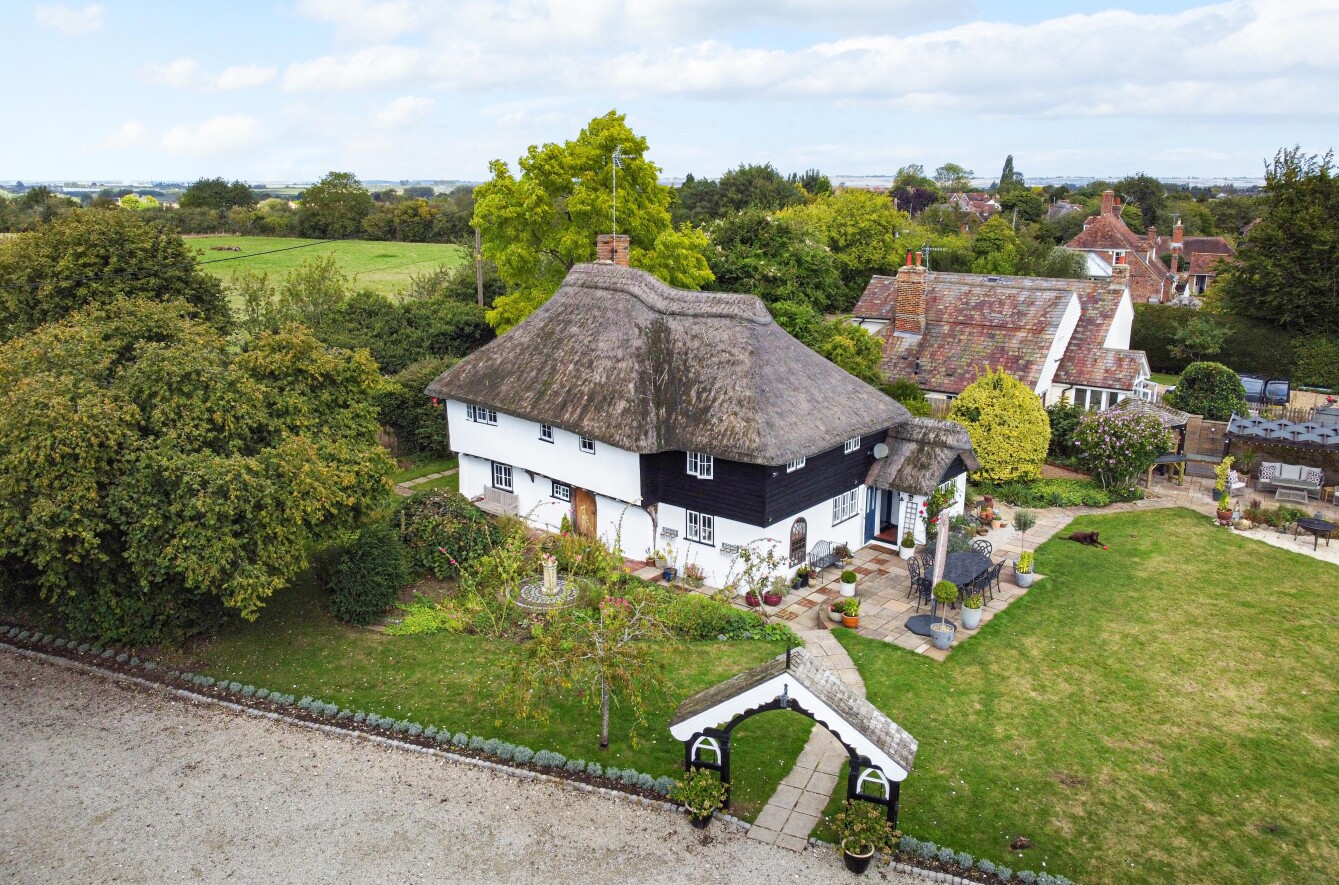 This charming detached thatched cottage sits on a generous plot and is sympathetically presented throughout, retaining a wealth of original character features including an impressive inglenook fireplace and exposed beams. The main house offers well-proportioned and versatile accommodation, with a welcoming open-plan kitchen/dining room featuring a Rangemaster gas stove/oven, a separate reception room, and a ground floor shower room. On the first floor there are three comfortable bedrooms along with a family bathroom, while the second floor provides a further bedroom or hobby room tucked neatly into the eaves. Outside, the property is complemented by a range of useful outbuildings, including a beautiful oak-framed summerhouse, three studios each with their own shower rooms, garages and a utility room. The property is surrounded by large gardens and benefits from excellent parking, all enjoying far-reaching views across the surrounding countryside. Cellar Hill is located in a Conservation Area on the southern outskirts of Teynham but falls within the parish of Lynsted. There is a choice of local shopping facilities, a primary school and mainline railway station in Teynham. A wider choice of shopping facilities and secondary schools is provided in Faversham and Sittingbourne, both about 4 miles away and which also offer excellent links to the Channel Tunnel and London St Pancras International.