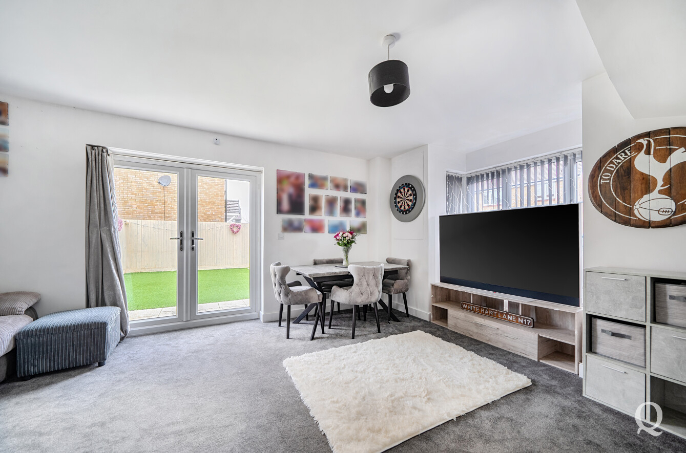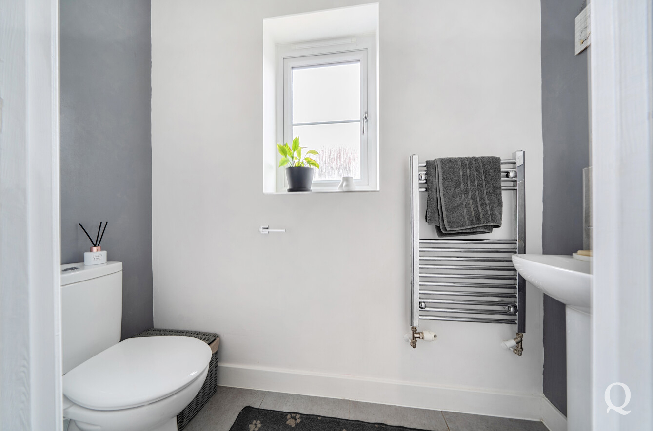 The ground floor centres around a spacious and stylish open-plan reception room, providing clearly defined living and dining areas with French doors opening directly onto the rear garden—perfect for entertaining or everyday family life. The contemporary kitchen sits separately, finished with sleek units, ample worktop space and integrated appliances, while a downstairs cloakroom completes the ground floor accommodation.