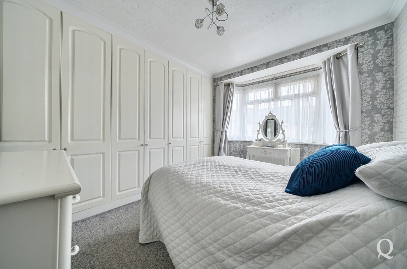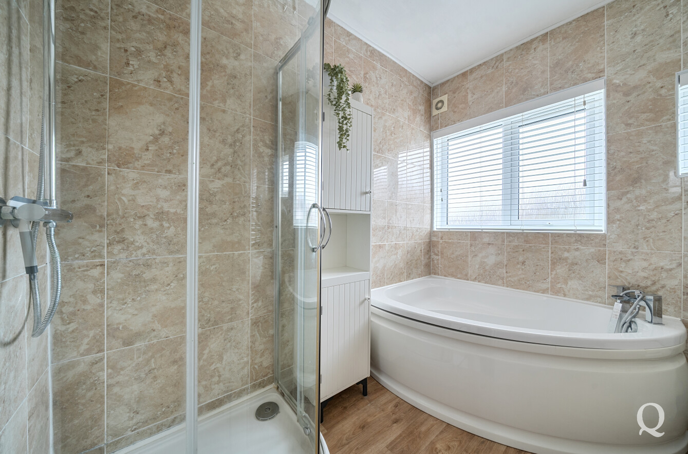 Upstairs, the property boasts two spacious double bedrooms, both benefiting from built-in wardrobes, along with a third bedroom perfect as a child’s room, guest space or home office. The family bathroom featuring a corner bath and a separate shower ideal for busy mornings or relaxed evenings.