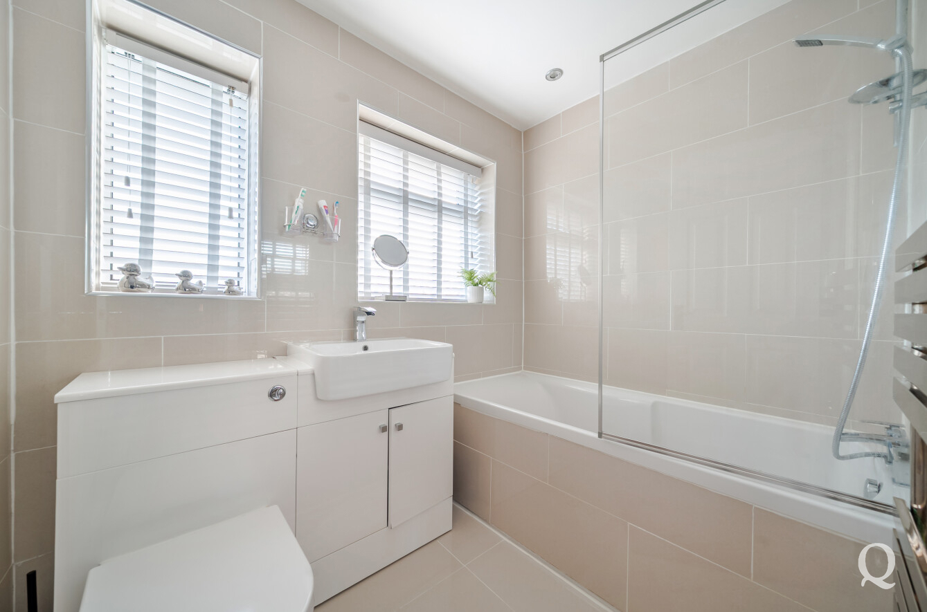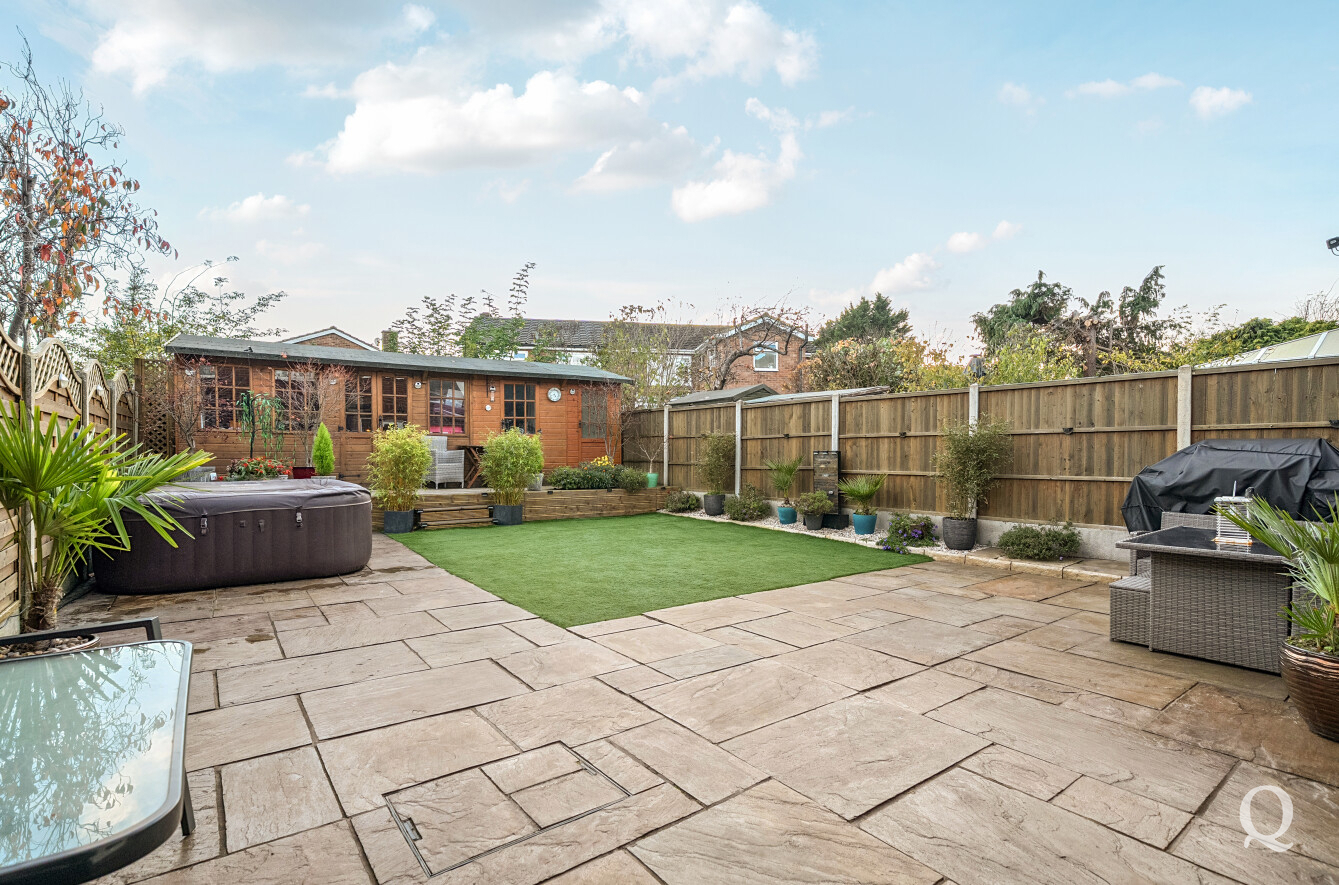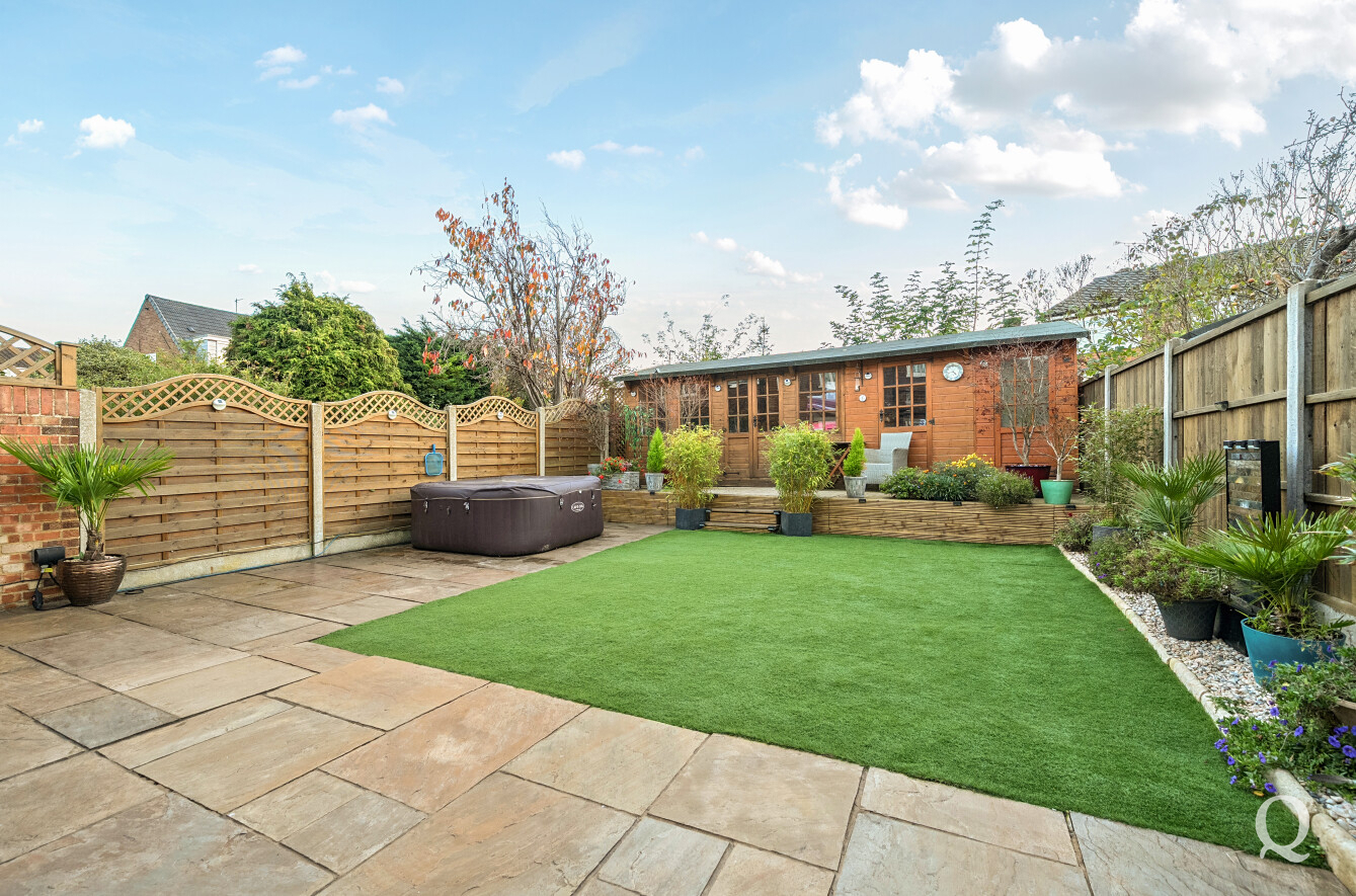Upstairs, three generously sized bedrooms are served by a contemporary family bathroom, all presented to a superb standard. The south-facing rear garden is a genuine highlight, offering a low-maintenance landscaped space ideal for relaxing, complete with a high-quality summerhouse — perfect as a home office, gym or entertaining room.