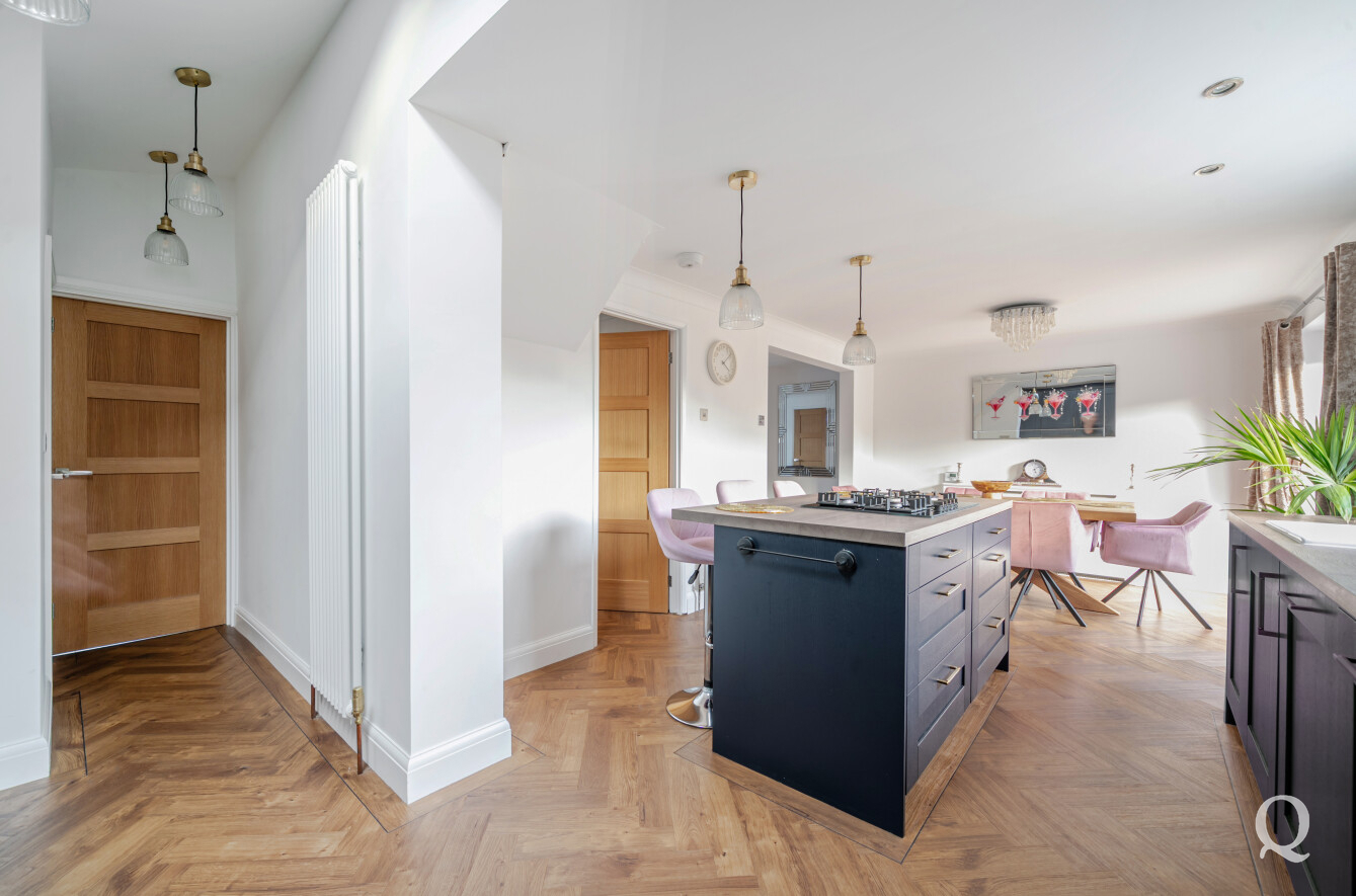 The spacious ground floor features a bright and stylish lounge with herringbone flooring, flowing through to a stunning open-plan kitchen/dining room complete with a central island, high-quality cabinetry, and ample space for entertaining. A versatile study or fourth bedroom, and sleek downstairs W/C further enhance the home’s practicality.