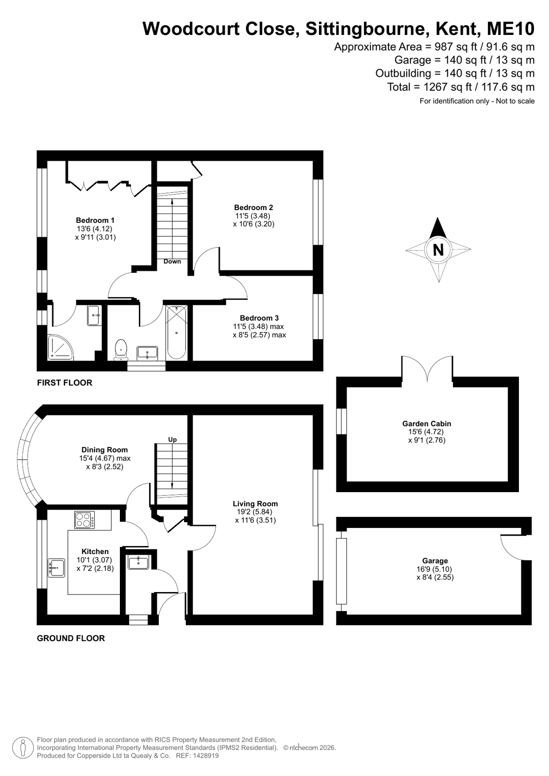 Situated in a sought-after cul-de-sac, this spacious Georgian-style semi-detached house offers well-proportioned and stylish accommodation throughout. The property is entered via a welcoming entrance hall which leads to a modern, well-appointed kitchen and a bright dining room featuring an impressive floor-to-ceiling bay window to the front, allowing plenty of natural light to flood the space. To the rear, there is a large reception room with patio doors opening directly onto the garden, creating an ideal setting for both relaxing and entertaining. A convenient downstairs WC completes the ground floor. Upstairs, the main bedroom benefits from a modern en-suite shower room, while two further good-sized bedrooms are served by a contemporary family bathroom. Outside, the property features a garage and driveway to the front providing off-road parking. To the rear is a low-maintenance, south-facing garden which enjoys plenty of sunshine and includes a substantial wooden cabin, ideal for use as a home office, studio, or additional entertaining space. Woodcourt Close is ideally situated close to King George's Playing Fields, to a choice of popular schools for children of all ages and about 0.75 miles from Sittingbourne Town Centre and Mainline Railway Station (offering regular High Speed services to London).