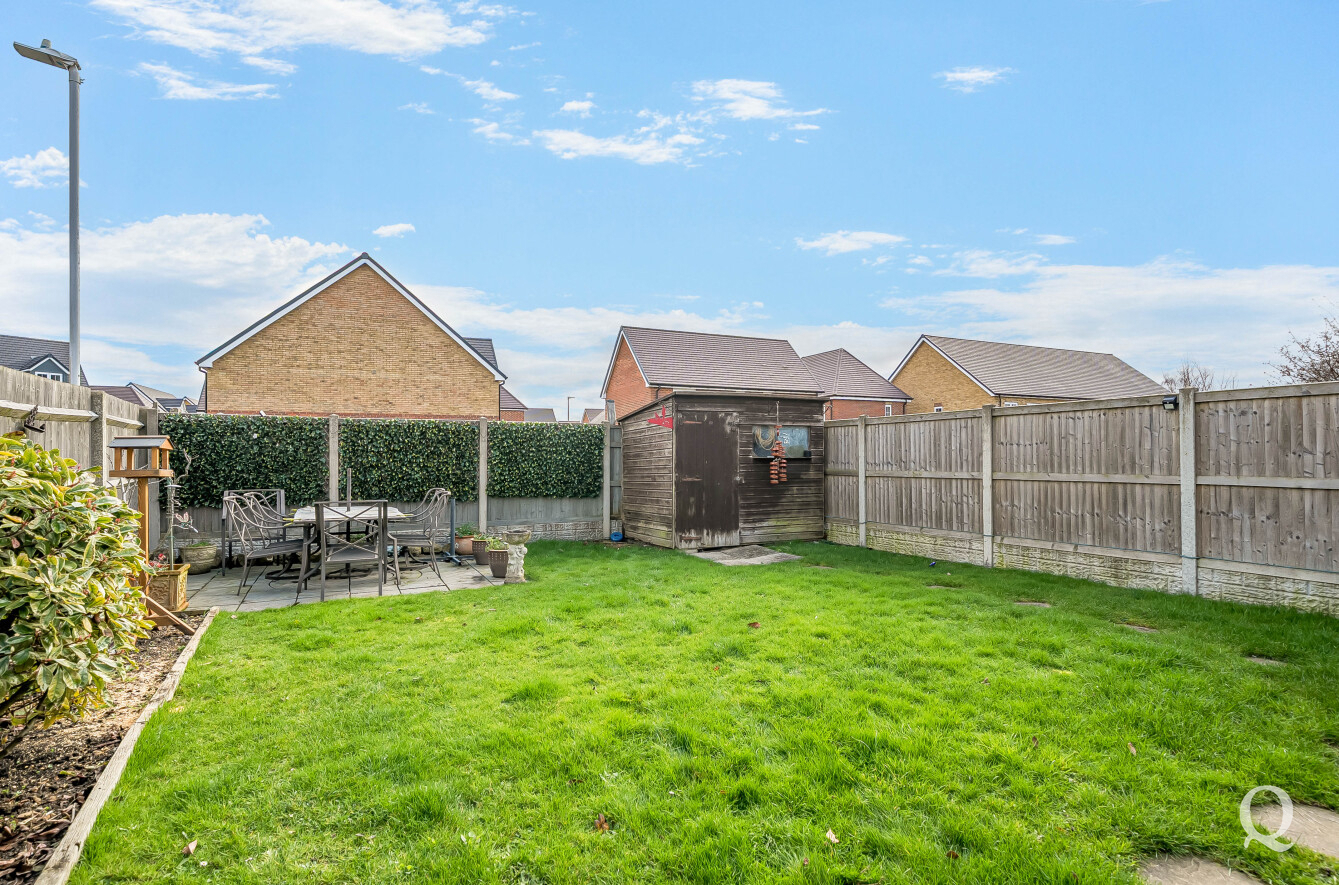 Externally, the home boasts a large block-paved driveway providing ample off-road parking for multiple vehicles. The rear garden is predominantly laid to lawn with patio seating space and a timber outbuilding, offering excellent outdoor space for families.