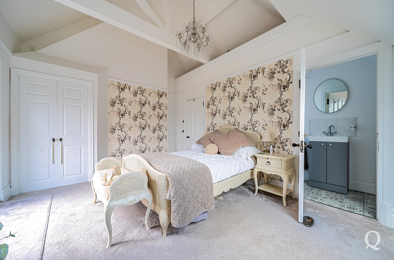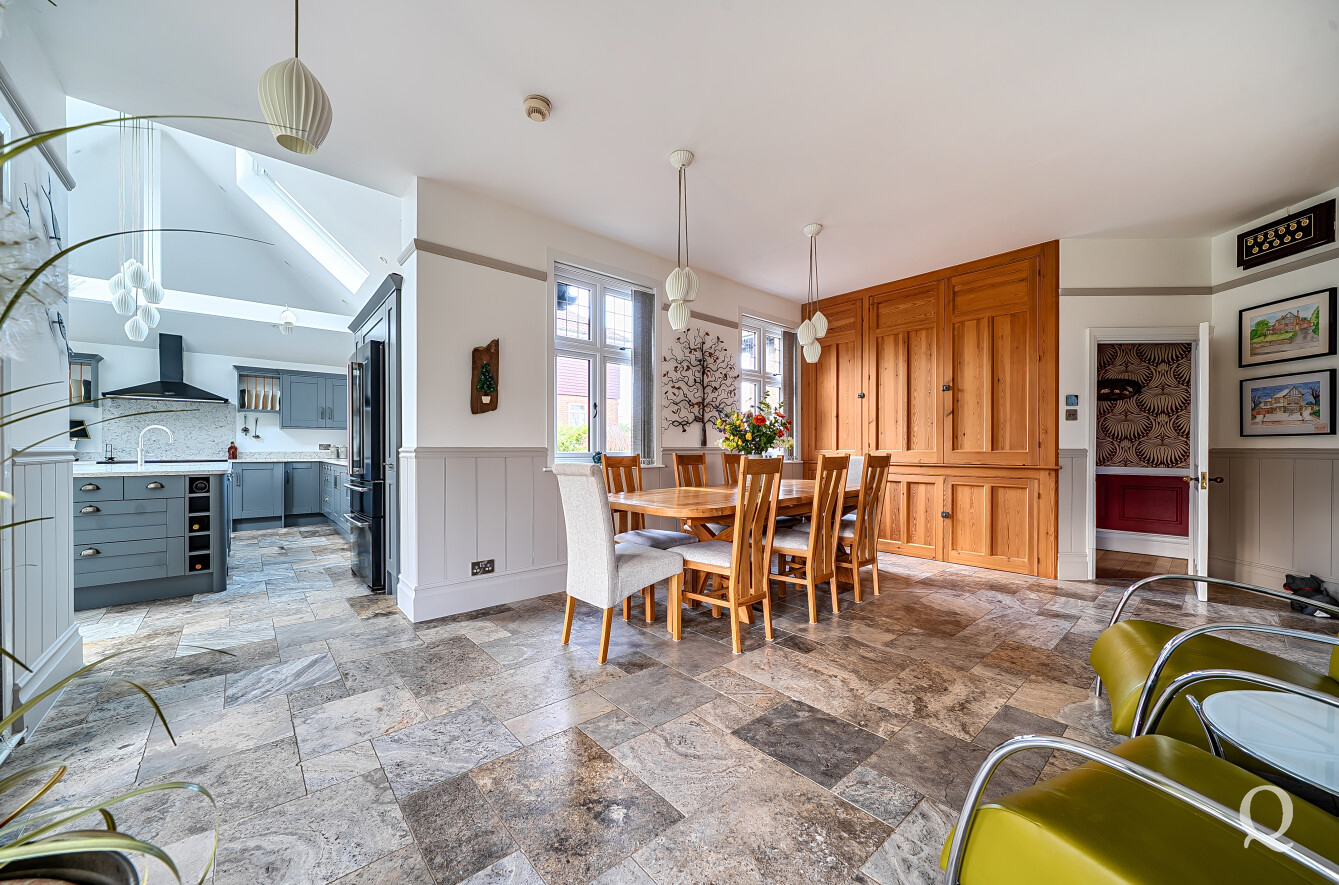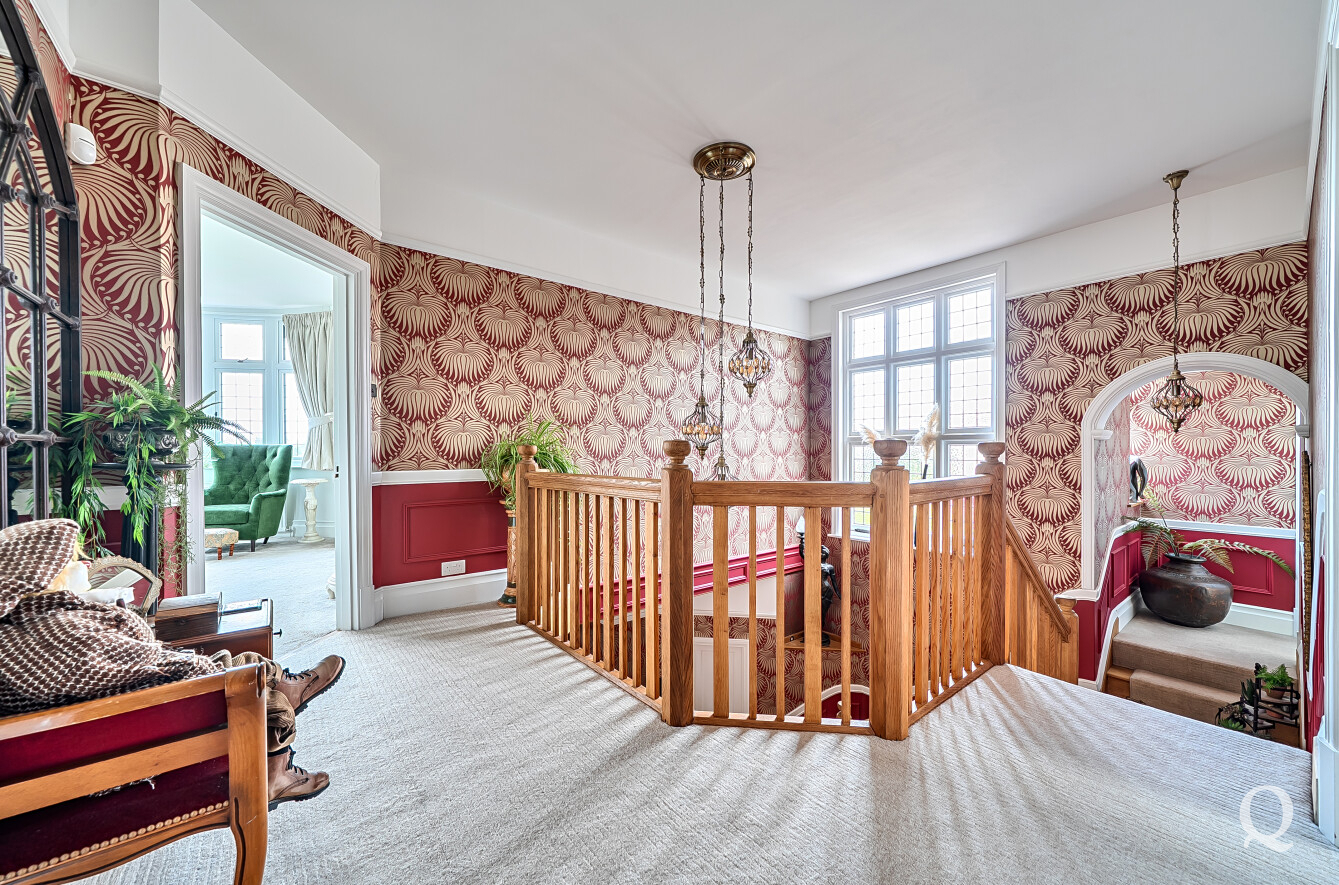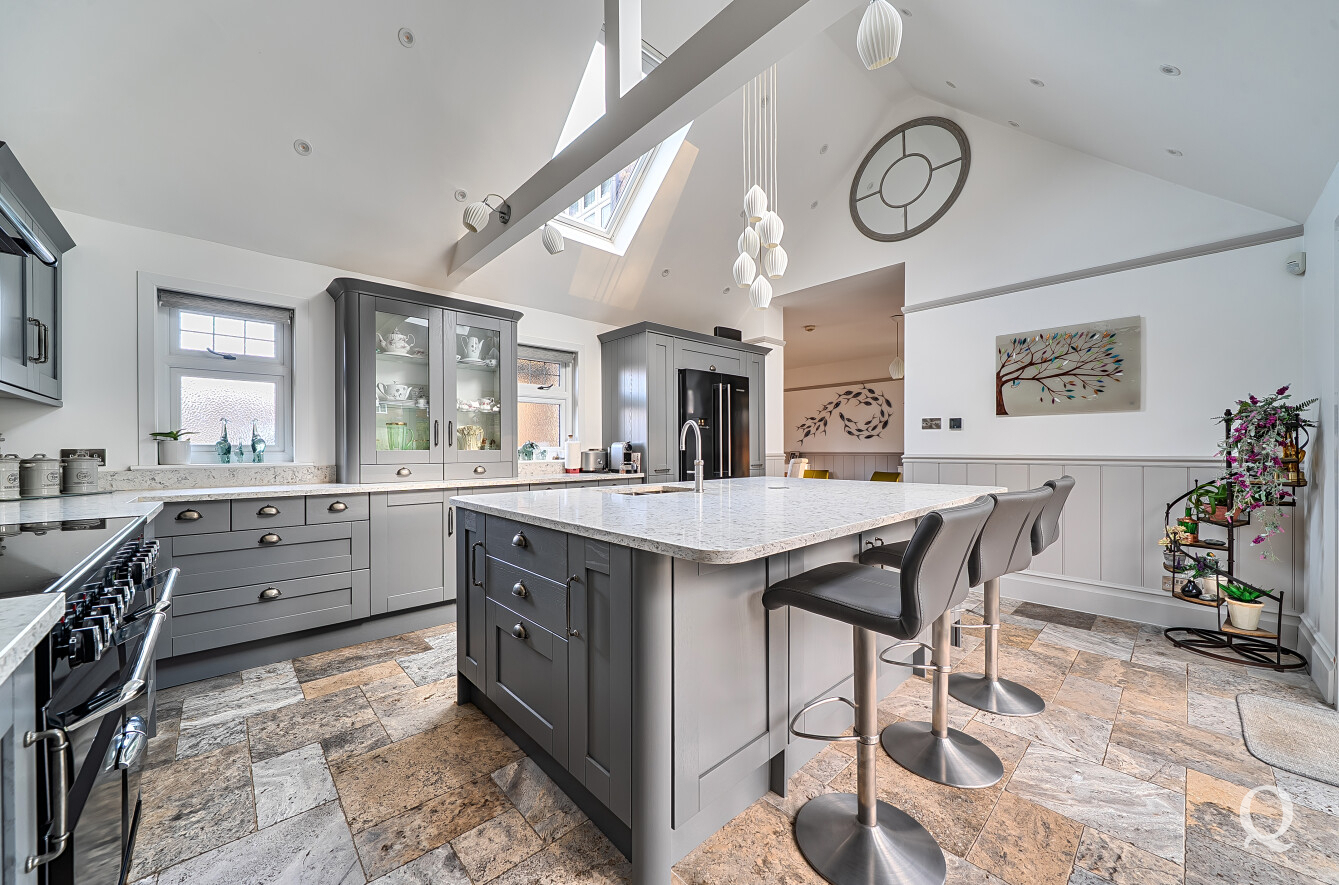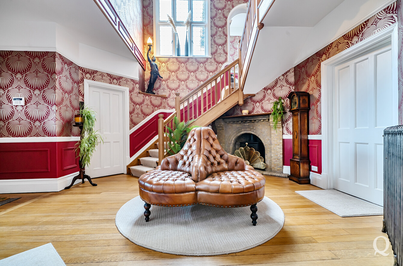 The property is approached through a large and impressive galleried entrance hall, setting the tone for the space and elegance found throughout. From here, a superb front reception room with a replacement wood burner enjoys a large bay window overlooking the frontage, while a separate dining room flows seamlessly into a fabulous modern kitchen, both of which benefit from electric underfloor heating. The kitchen also features solar powered Velux windows and bi-fold doors opening directly onto the rear garden – ideal for both family life and entertaining. A second reception room to the rear benefits from a replacement wood burner and French doors to the garden. A conveniently positioned downstairs WC completes the ground floor. To the first floor, the principal bedroom is located to the front of the house and features a large bay window, a stylish en-suite shower room and a dedicated dressing room. The second bedroom also benefits from its own en-suite shower room and a balcony, while two further generous double bedrooms are served by a spacious family bathroom, fitted with a freestanding bath and a separate shower cubicle. Externally, the property offers an impressive ‘in and out’ driveway providing parking for multiple vehicles, together with a double garage. To the rear is a large, south-facing landscaped garden, thoughtfully arranged and incorporating a range of useful and attractive outbuildings, including a Barbeque Hut Kota, a workshop, store, summer house with additional storage and an outside WC attached to the rear of the garage. This is a truly outstanding home, presented to a very high standard throughout and beautifully in keeping with the age and character of the property, in a highly sought-after location.