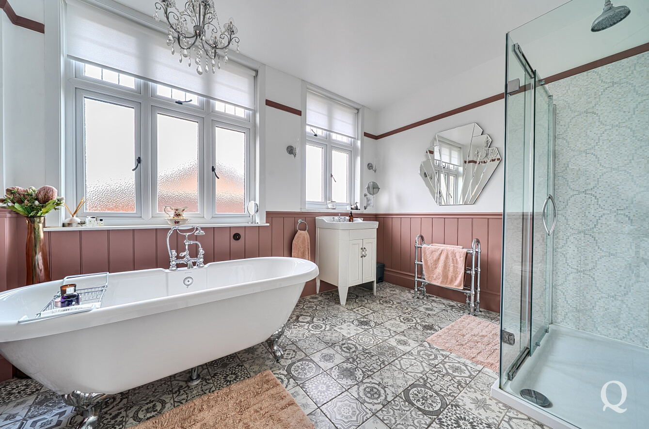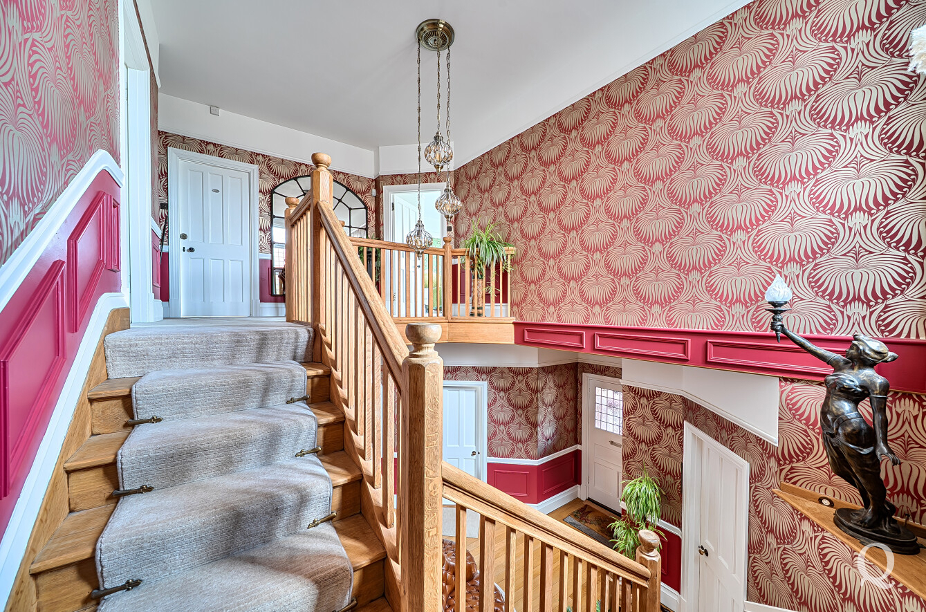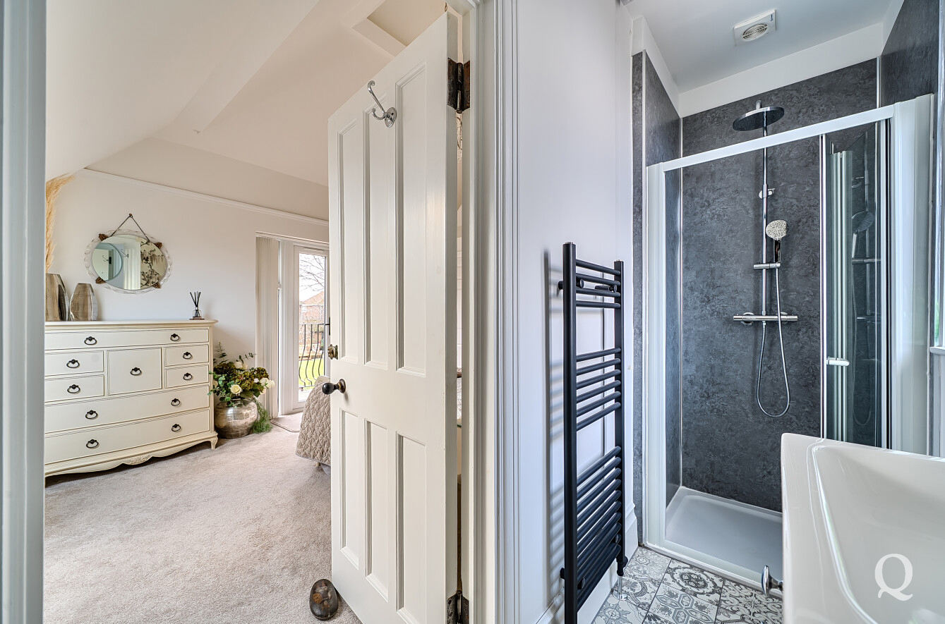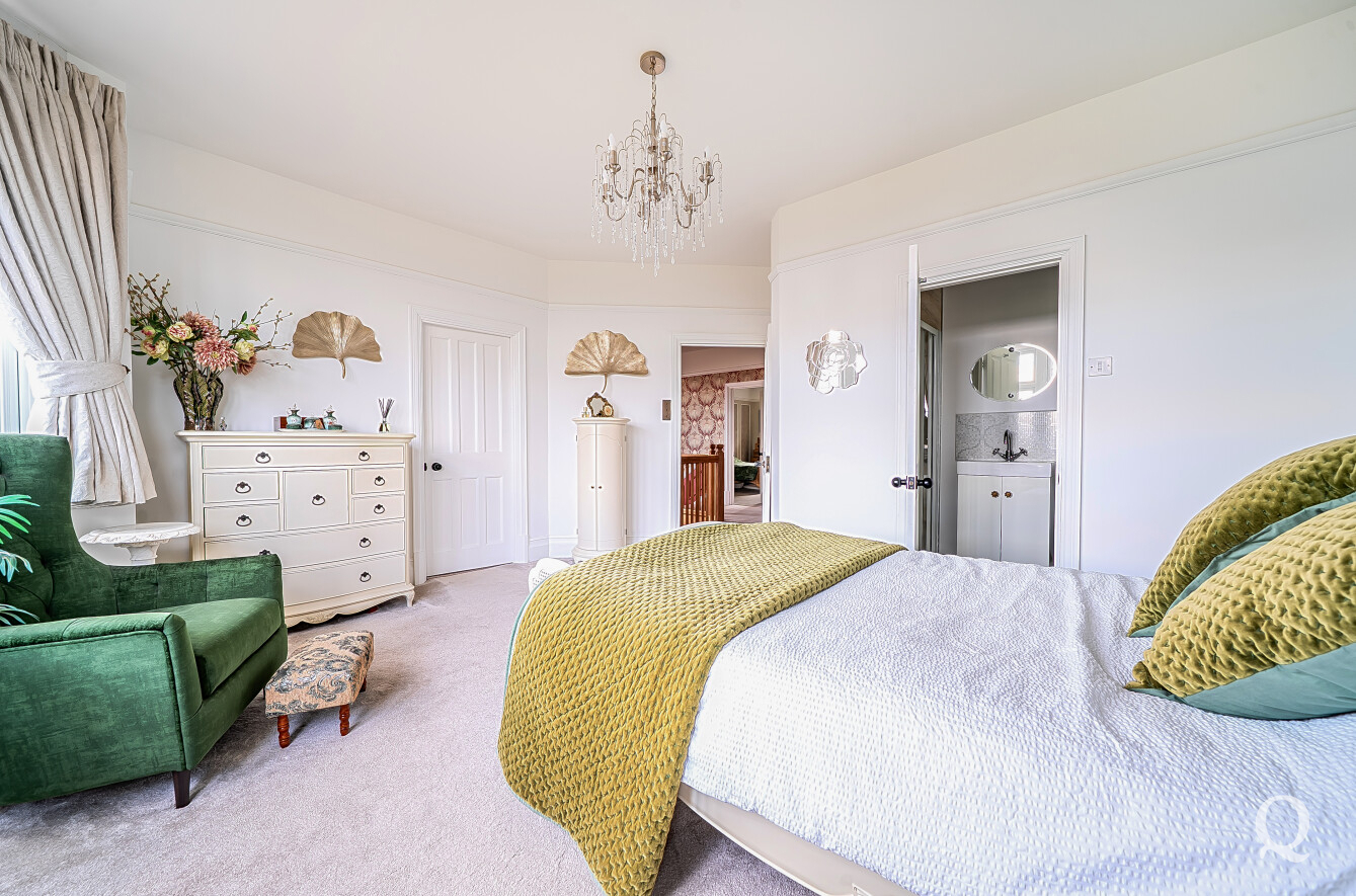 The property is approached through a large and impressive galleried entrance hall, setting the tone for the space and elegance found throughout. From here, a superb front reception room with a replacement wood burner enjoys a large bay window overlooking the frontage, while a separate dining room flows seamlessly into a fabulous modern kitchen, both of which benefit from electric underfloor heating. The kitchen also features solar powered Velux windows and bi-fold doors opening directly onto the rear garden – ideal for both family life and entertaining. A second reception room to the rear benefits from a replacement wood burner and French doors to the garden. A conveniently positioned downstairs WC completes the ground floor. To the first floor, the principal bedroom is located to the front of the house and features a large bay window, a stylish en-suite shower room and a dedicated dressing room. The second bedroom also benefits from its own en-suite shower room and a balcony, while two further generous double bedrooms are served by a spacious family bathroom, fitted with a freestanding bath and a separate shower cubicle. Externally, the property offers an impressive ‘in and out’ driveway providing parking for multiple vehicles, together with a double garage. To the rear is a large, south-facing landscaped garden, thoughtfully arranged and incorporating a range of useful and attractive outbuildings, including a Barbeque Hut Kota, a workshop, store, summer house with additional storage and an outside WC attached to the rear of the garage. This is a truly outstanding home, presented to a very high standard throughout and beautifully in keeping with the age and character of the property, in a highly sought-after location.