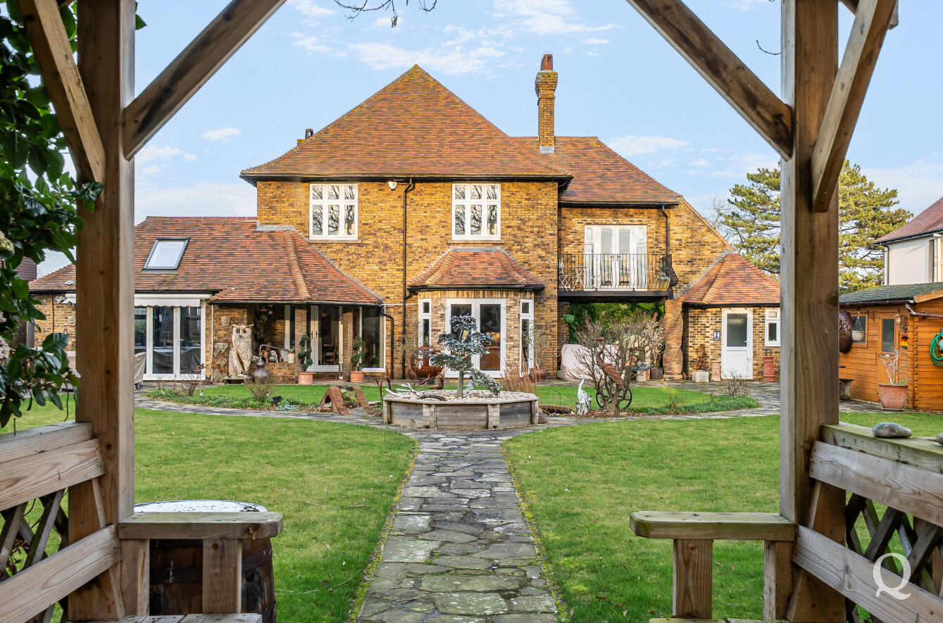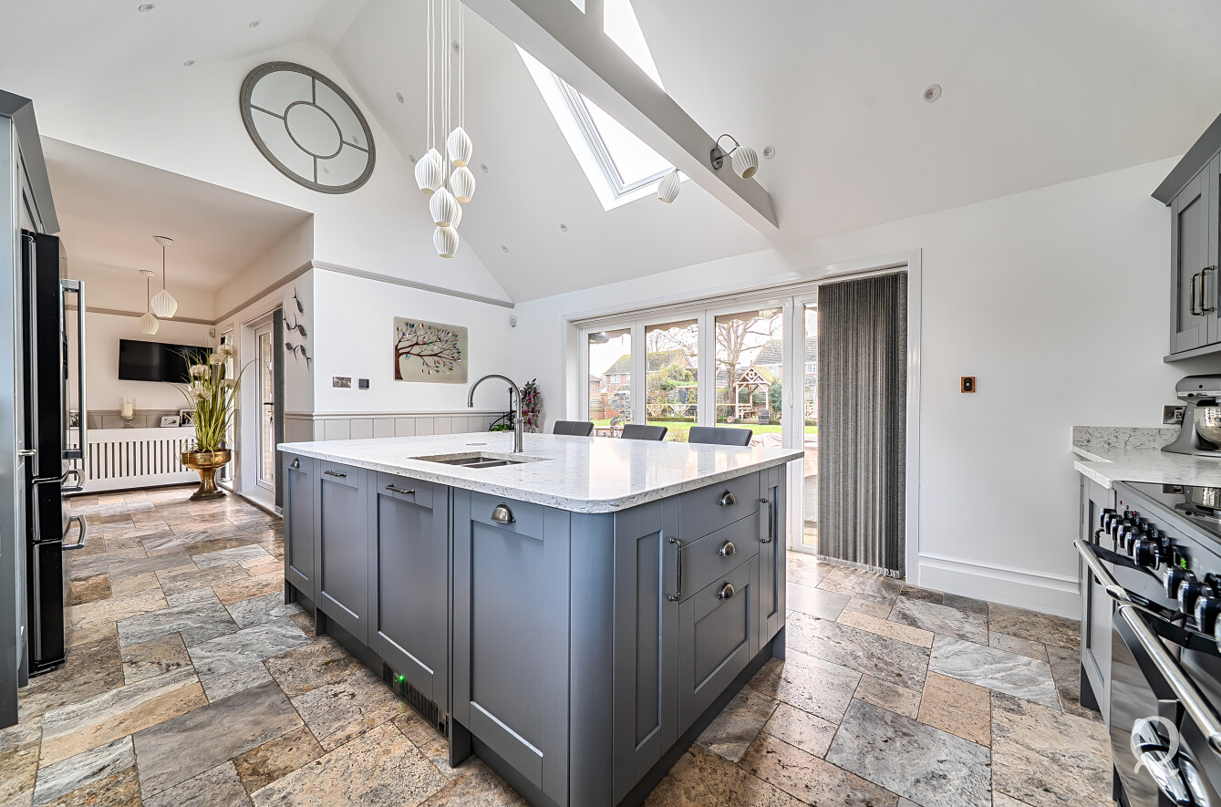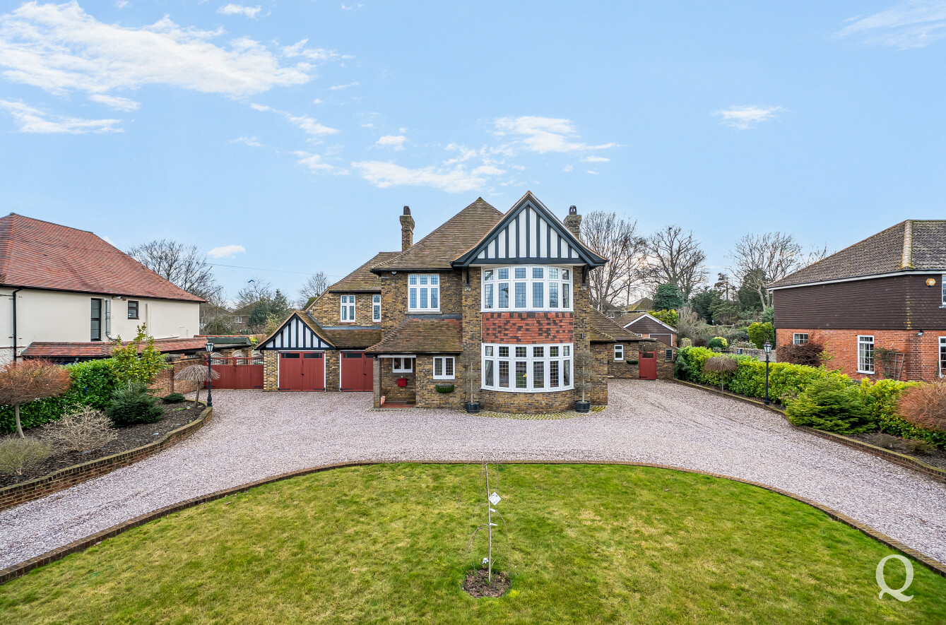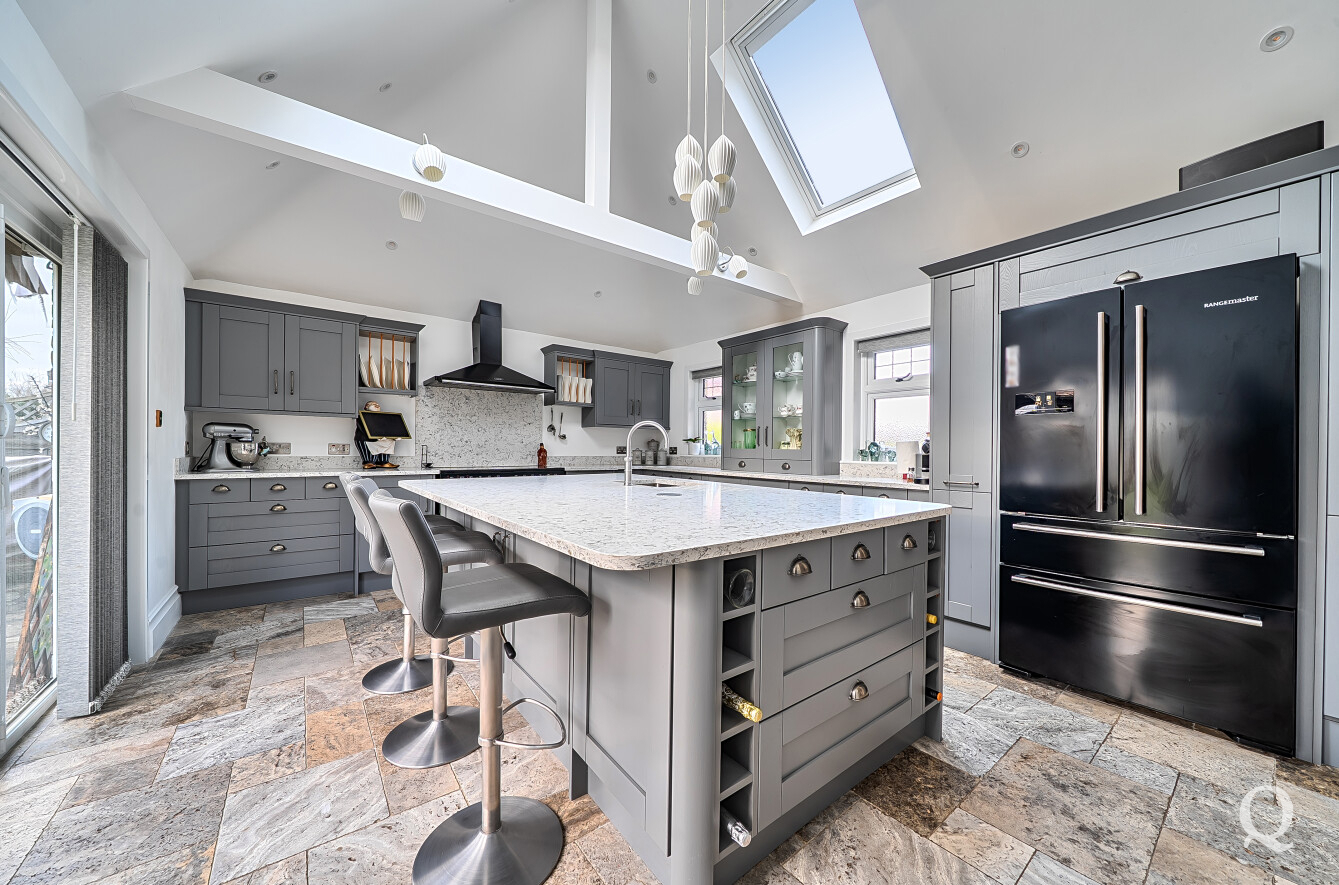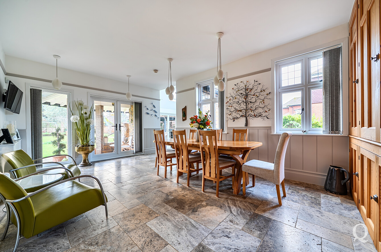 The property is approached through a large and impressive galleried entrance hall, setting the tone for the space and elegance found throughout. From here, a superb front reception room with a replacement wood burner enjoys a large bay window overlooking the frontage, while a separate dining room flows seamlessly into a fabulous modern kitchen, both of which benefit from electric underfloor heating. The kitchen also features solar powered Velux windows and bi-fold doors opening directly onto the rear garden – ideal for both family life and entertaining. A second reception room to the rear benefits from a replacement wood burner and French doors to the garden. A conveniently positioned downstairs WC completes the ground floor. To the first floor, the principal bedroom is located to the front of the house and features a large bay window, a stylish en-suite shower room and a dedicated dressing room. The second bedroom also benefits from its own en-suite shower room and a balcony, while two further generous double bedrooms are served by a spacious family bathroom, fitted with a freestanding bath and a separate shower cubicle. Externally, the property offers an impressive ‘in and out’ driveway providing parking for multiple vehicles, together with a double garage. To the rear is a large, south-facing landscaped garden, thoughtfully arranged and incorporating a range of useful and attractive outbuildings, including a Barbeque Hut Kota, a workshop, store, summer house with additional storage and an outside WC attached to the rear of the garage. This is a truly outstanding home, presented to a very high standard throughout and beautifully in keeping with the age and character of the property, in a highly sought-after location.