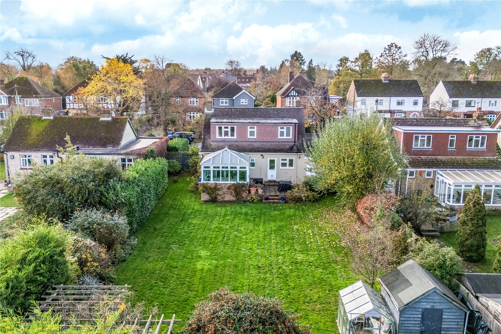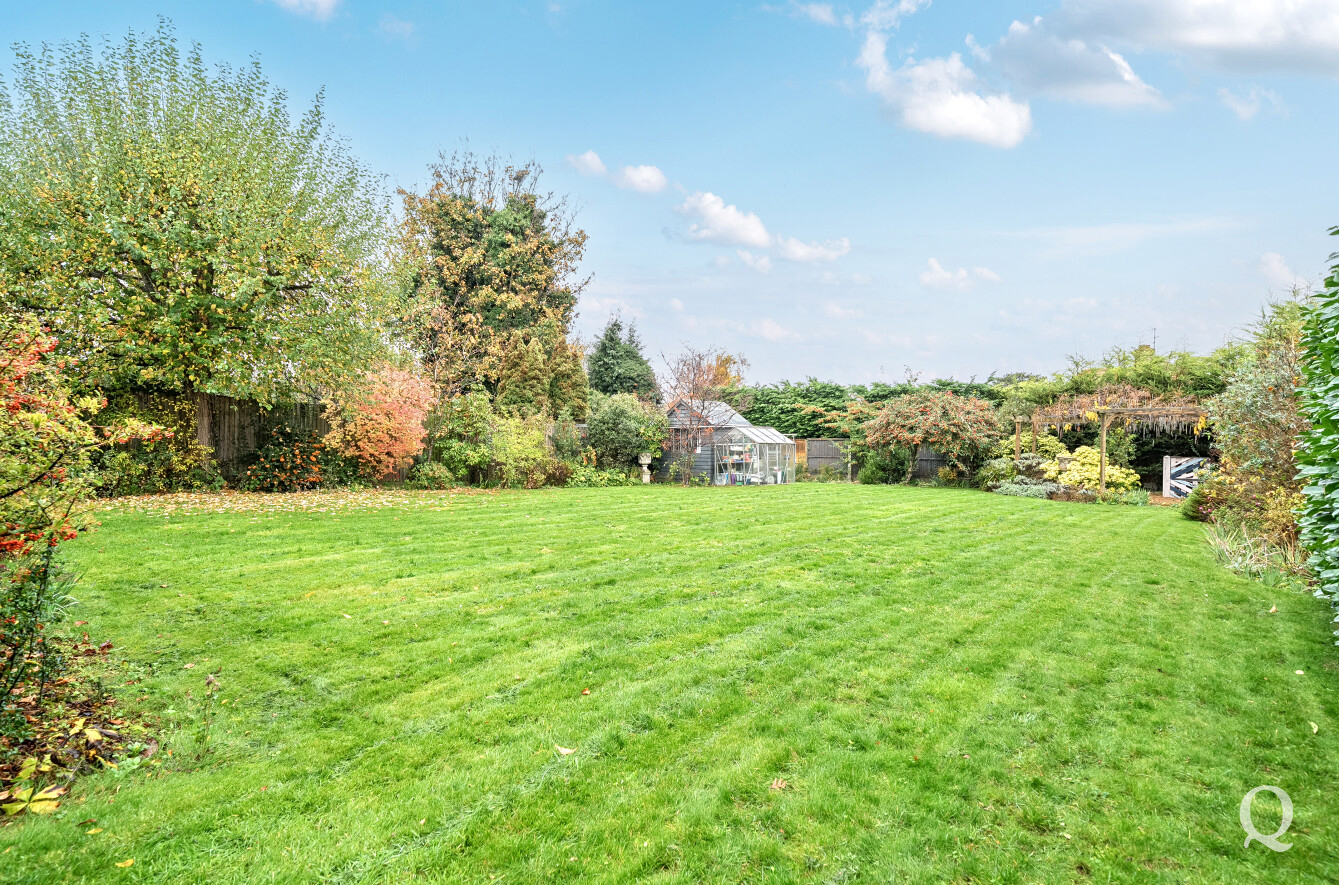 Outside, the garden is a true highlight of the property — generous, private, and thoughtfully landscaped. A patio area extends from the rear of the house, providing an excellent setting for outdoor dining and summer gatherings. The mature lawn, surrounded by established shrubs and trees, offers a tranquil backdrop and a sense of seclusion rarely found so close to town.