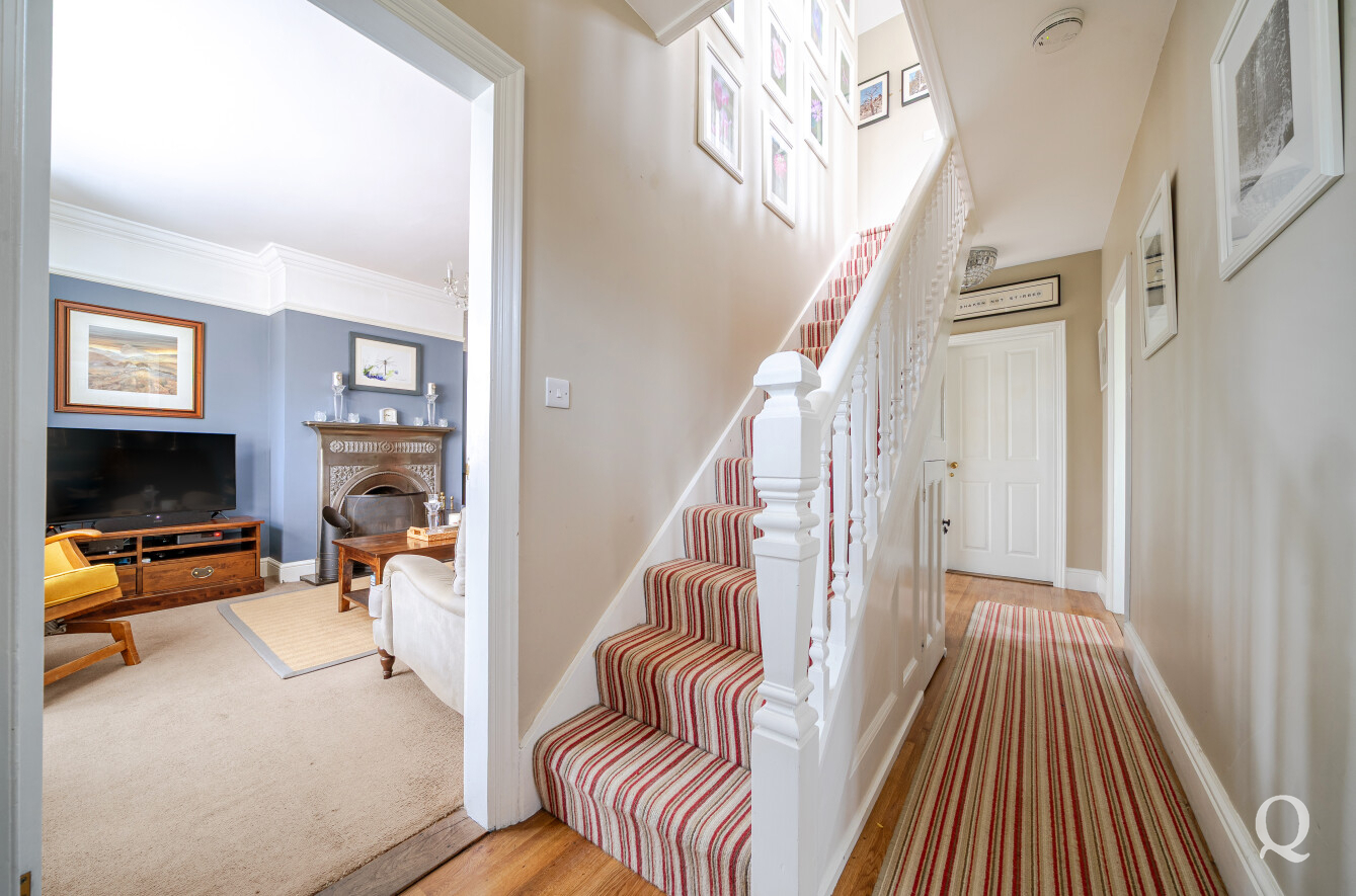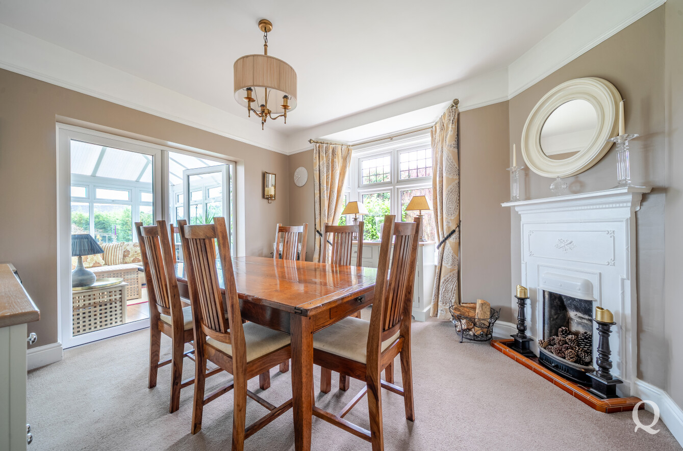 Inside, the home exudes warmth and charm, with tasteful décor and original features that have been thoughtfully retained. The ground floor offers a superb flow of accommodation, beginning with a welcoming reception room centred around a decorative fireplace and framed by a wide bay window that fills the space with light. The formal dining room is equally inviting, featuring a fireplace and double doors that open through to a bright conservatory overlooking the garden — a perfect space for entertaining or relaxing throughout the seasons. The well-appointed kitchen sits at the heart of the home, complemented by a practical utility room and ground floor cloakroom. A versatile ground floor bedroom provides an ideal guest room, study, or snug.