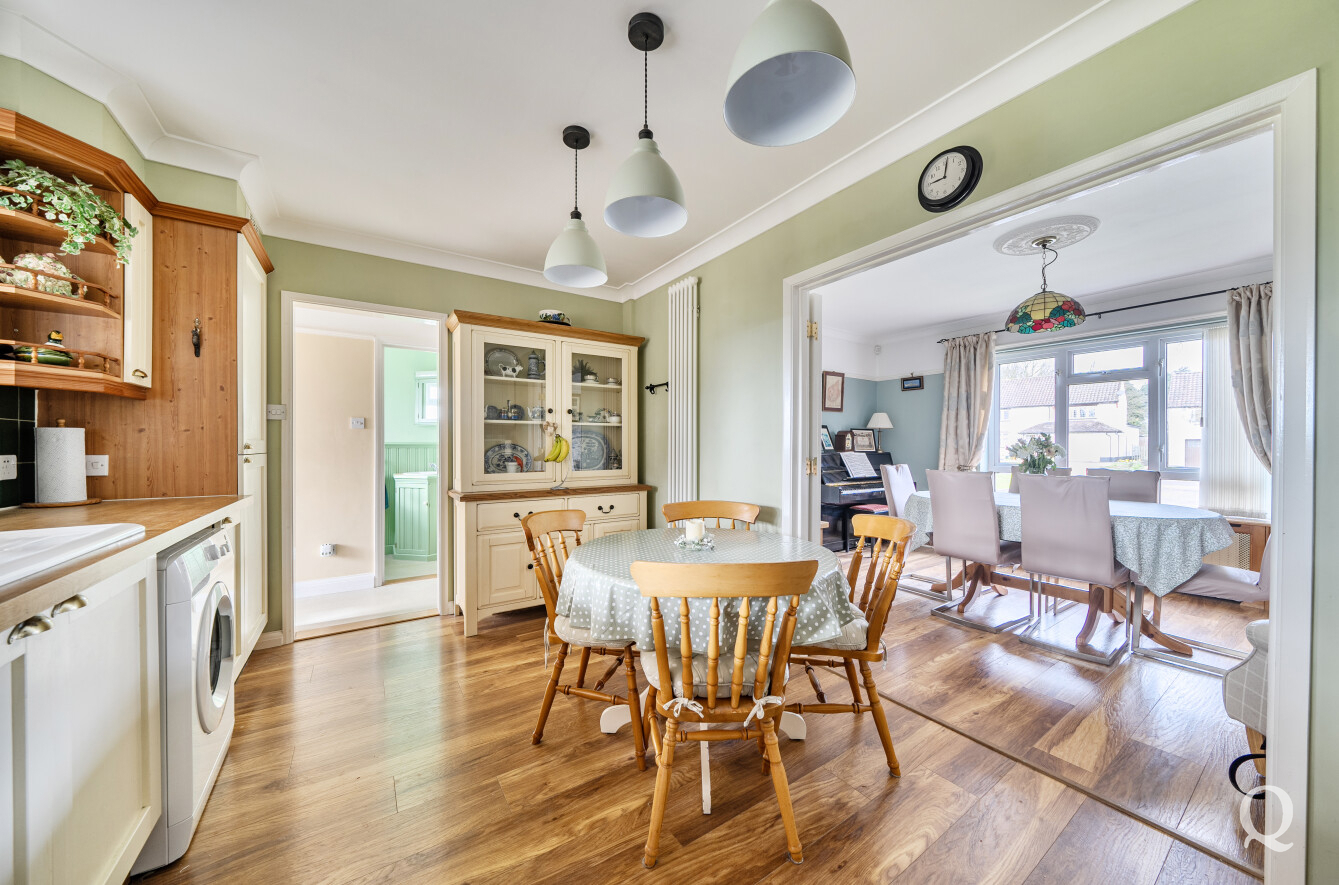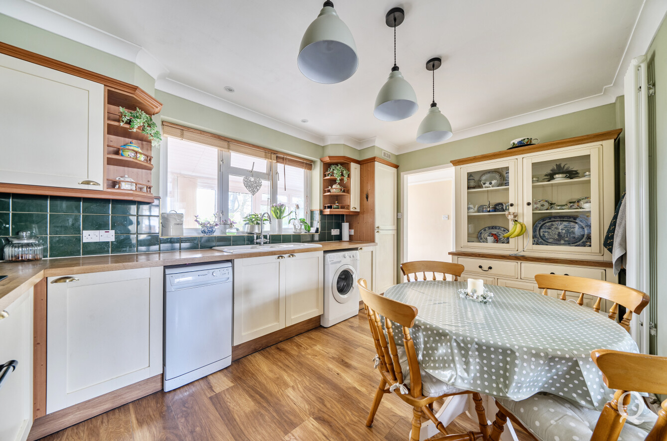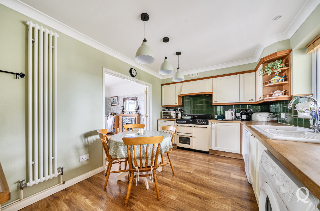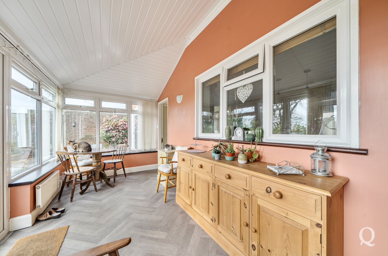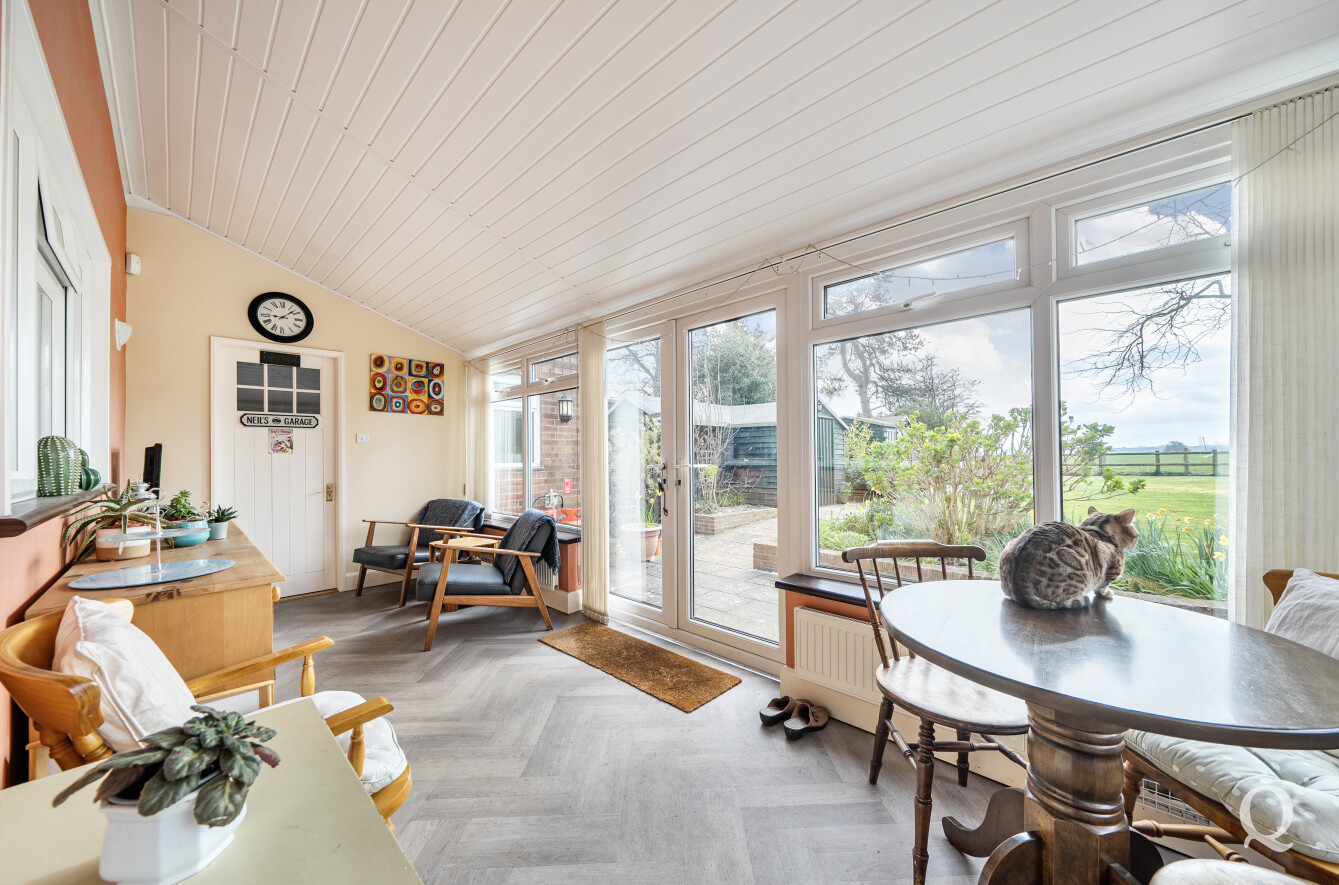 The well-appointed kitchen is thoughtfully arranged with ample storage and workspace, and leads through to a delightful sun room — a standout feature of the home — offering panoramic views across the garden and beyond, making it the perfect spot to relax throughout the seasons.