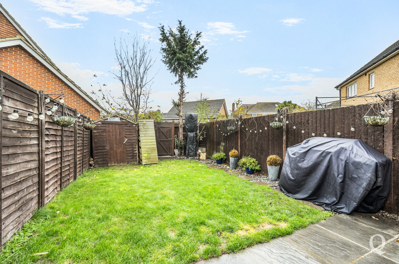 Outside, the rear garden offers a mix of patio and lawn, ideal for outdoor dining and relaxation, with a garage located close by for convenient parking or storage.