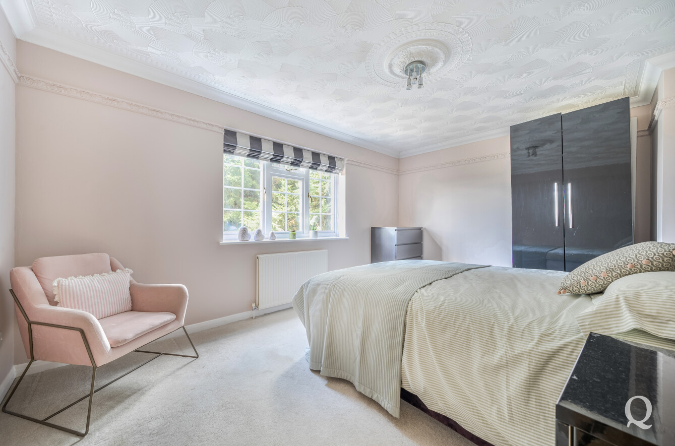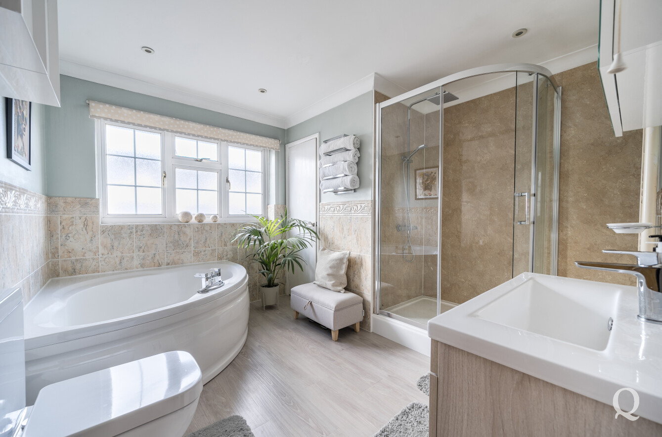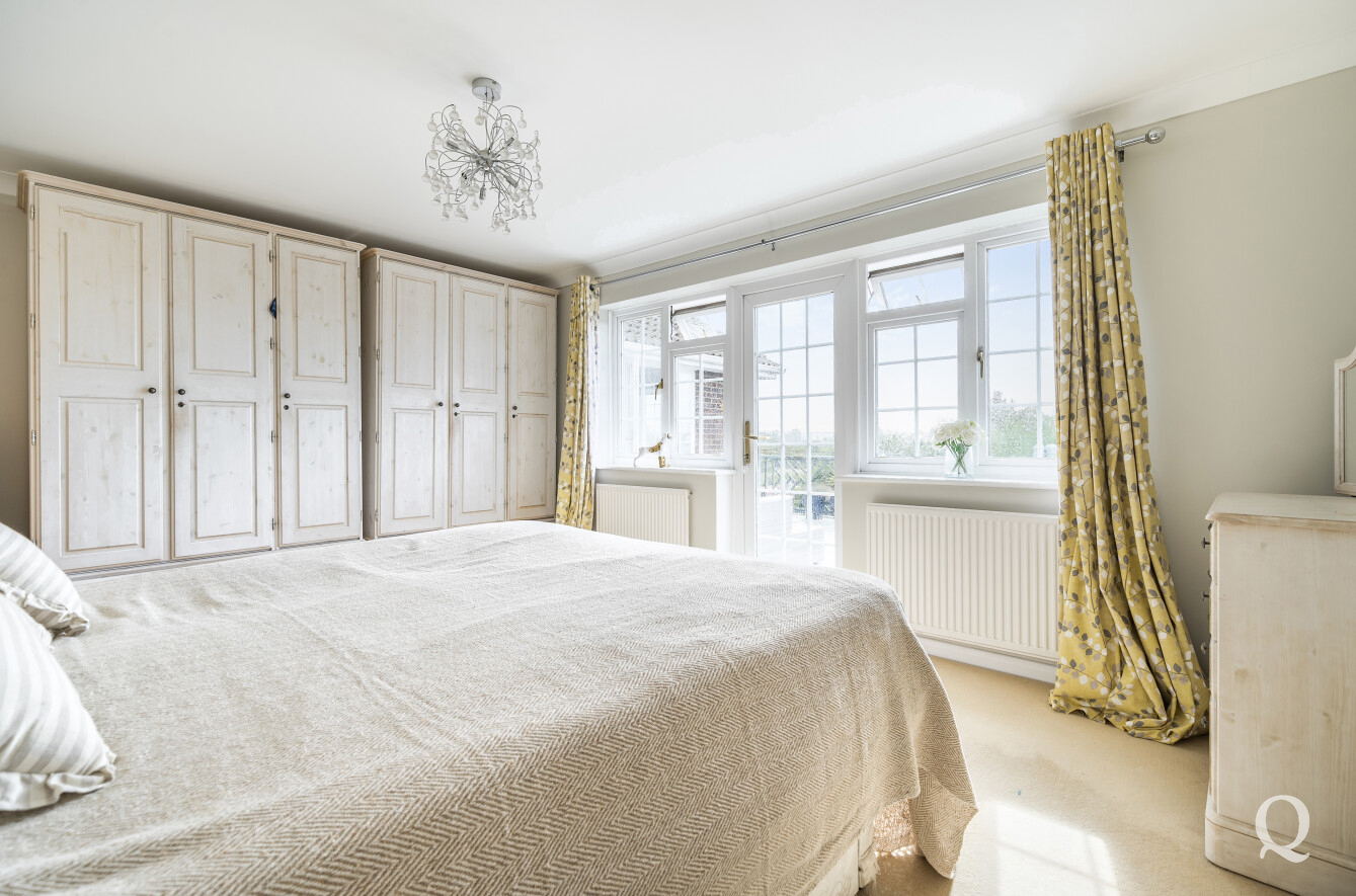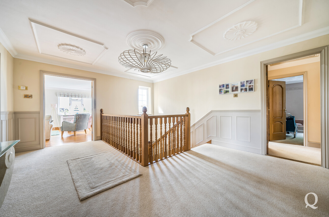 This floor also houses three of the property’s five principal bedrooms. The principal bedroom is a peaceful retreat, generously sized and beautifully presented. A second large double bedroom provides excellent accommodation for family or guests, while a fifth bedroom offers versatility as a nursery, dressing room, or study. A stylish family bathroom, fitted with both bath and separate shower, completes the first floor.
