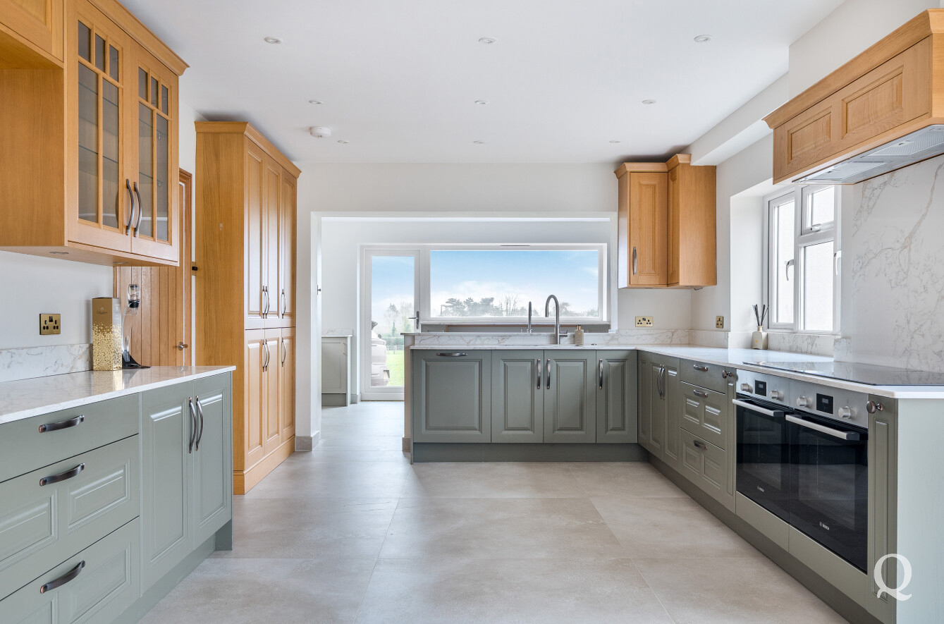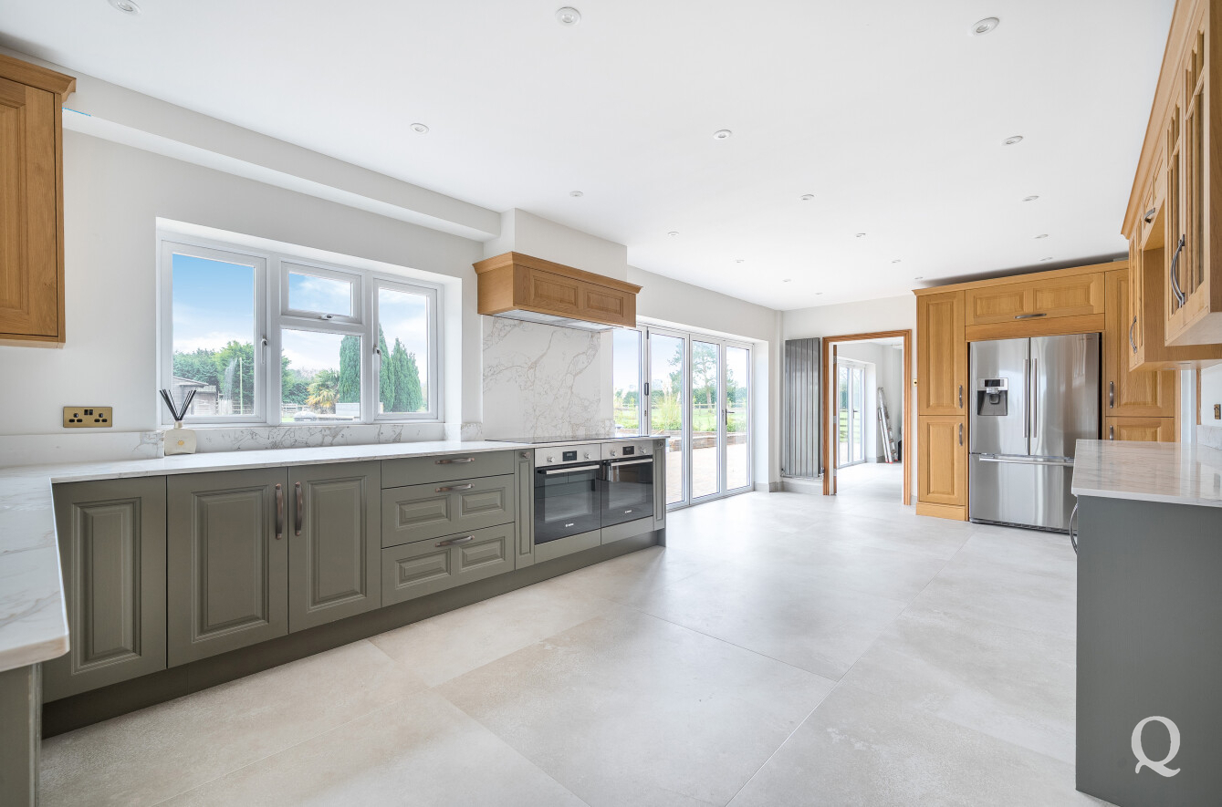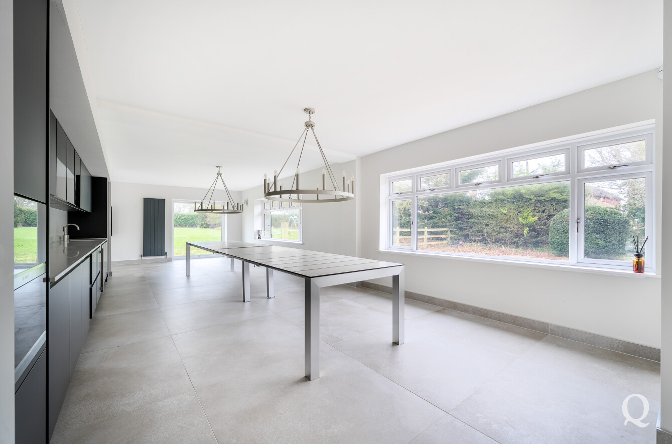 The ground floor is centred around a superb open-plan kitchen, dining, and reception room, measuring over 36 feet in length. This outstanding space forms the heart of the home and is ideal for modern family life and entertaining, featuring ample room for cooking, dining, and relaxing while enjoying views over the gardens. A central island and extensive work surfaces create a highly functional culinary environment, complemented by generous storage and preparation areas.