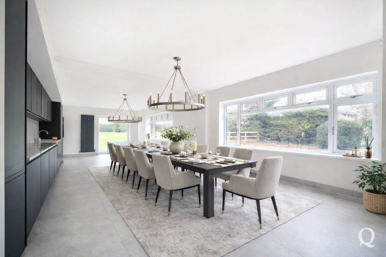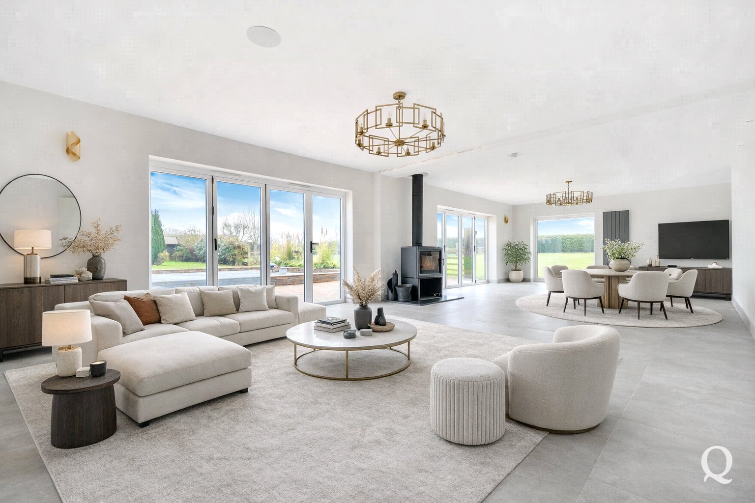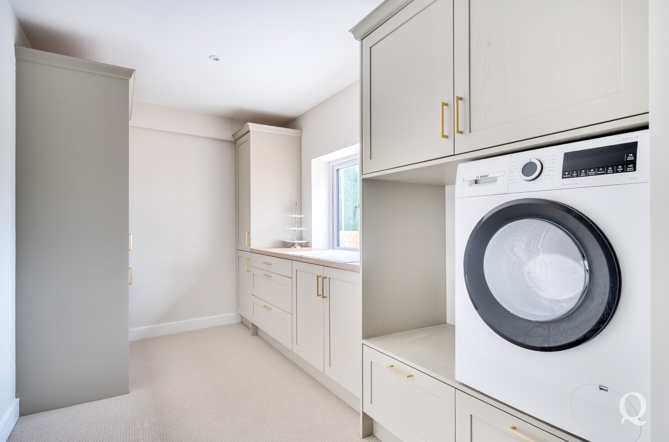 The ground floor is centred around a superb open-plan kitchen, dining, and reception room, measuring over 36 feet in length. This outstanding space forms the heart of the home and is ideal for modern family life and entertaining, featuring ample room for cooking, dining, and relaxing while enjoying views over the gardens. A central island and extensive work surfaces create a highly functional culinary environment, complemented by generous storage and preparation areas.