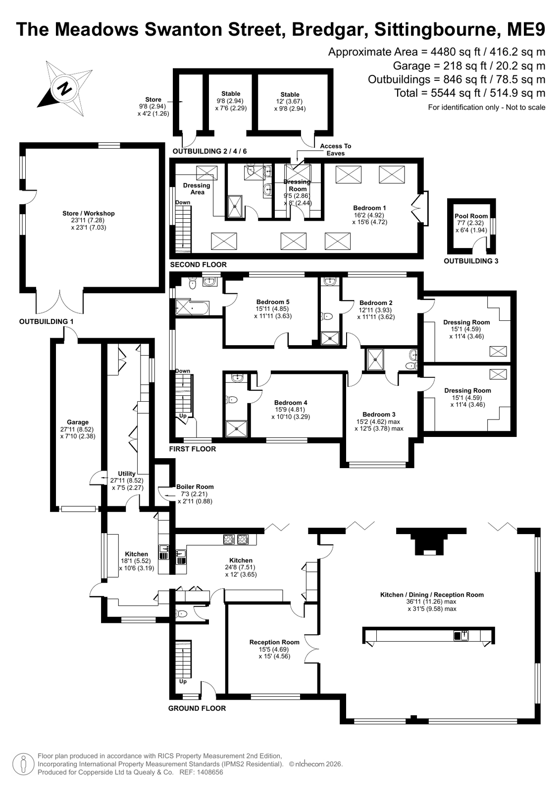 Set on the outskirts of the picturesque village of Bredgar, The Meadows is an exceptional and substantial detached country residence offering versatile accommodation extending to approximately 4,480 sq ft, with additional garaging and outbuildings bringing the total to around 5,544 sq ft set on a plot of 1.45 acres. This impressive home combines traditional rural charm with generous modern living, making it ideal for families, multi-generational living, home working, or those seeking space and privacy in a highly desirable Kentish setting.