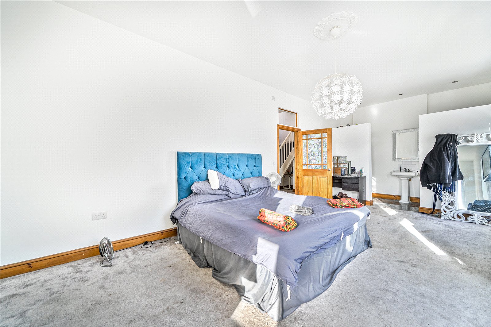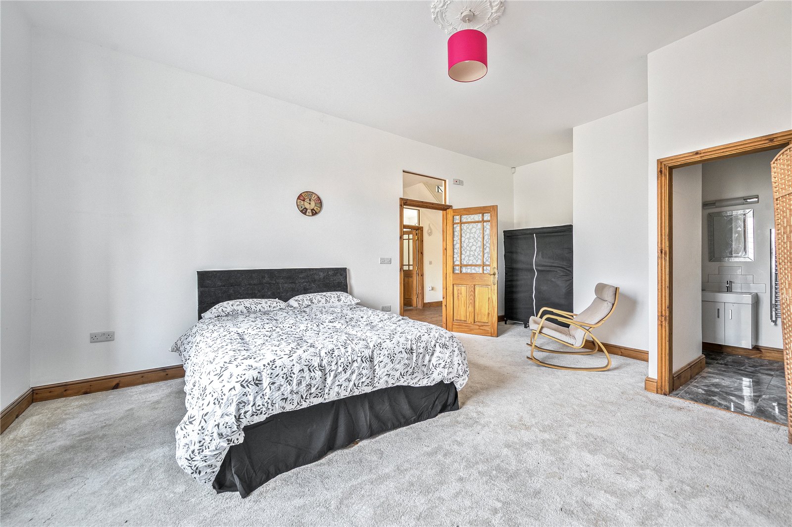 The opposite wing of the home includes three further bedrooms, including a spacious principal bedroom with en-suite, alongside a family bathroom. The second floor in this section offers another large double bedroom with its own en-suite shower room, creating an ideal private suite for guests, older children, or extended family.