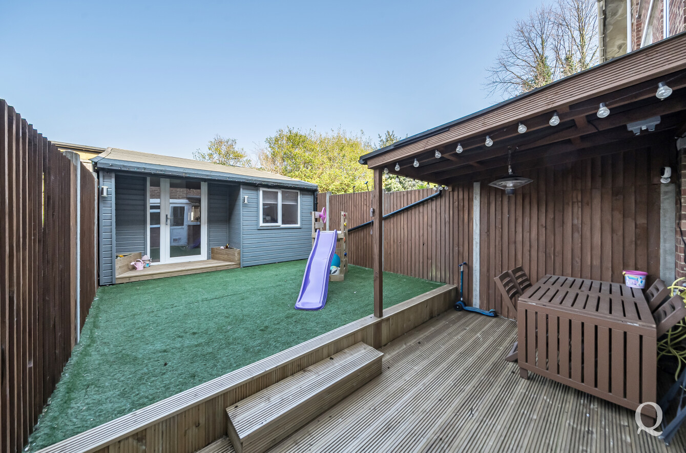 Externally, the property benefits from a low-maintenance rear garden designed for both relaxation and practicality, featuring a decked seating area and artificial lawn. A standout feature is the detached outbuilding, currently utilised as a home office and storage space—ideal for remote working or additional flexibility. To the front, the property offers driveway parking