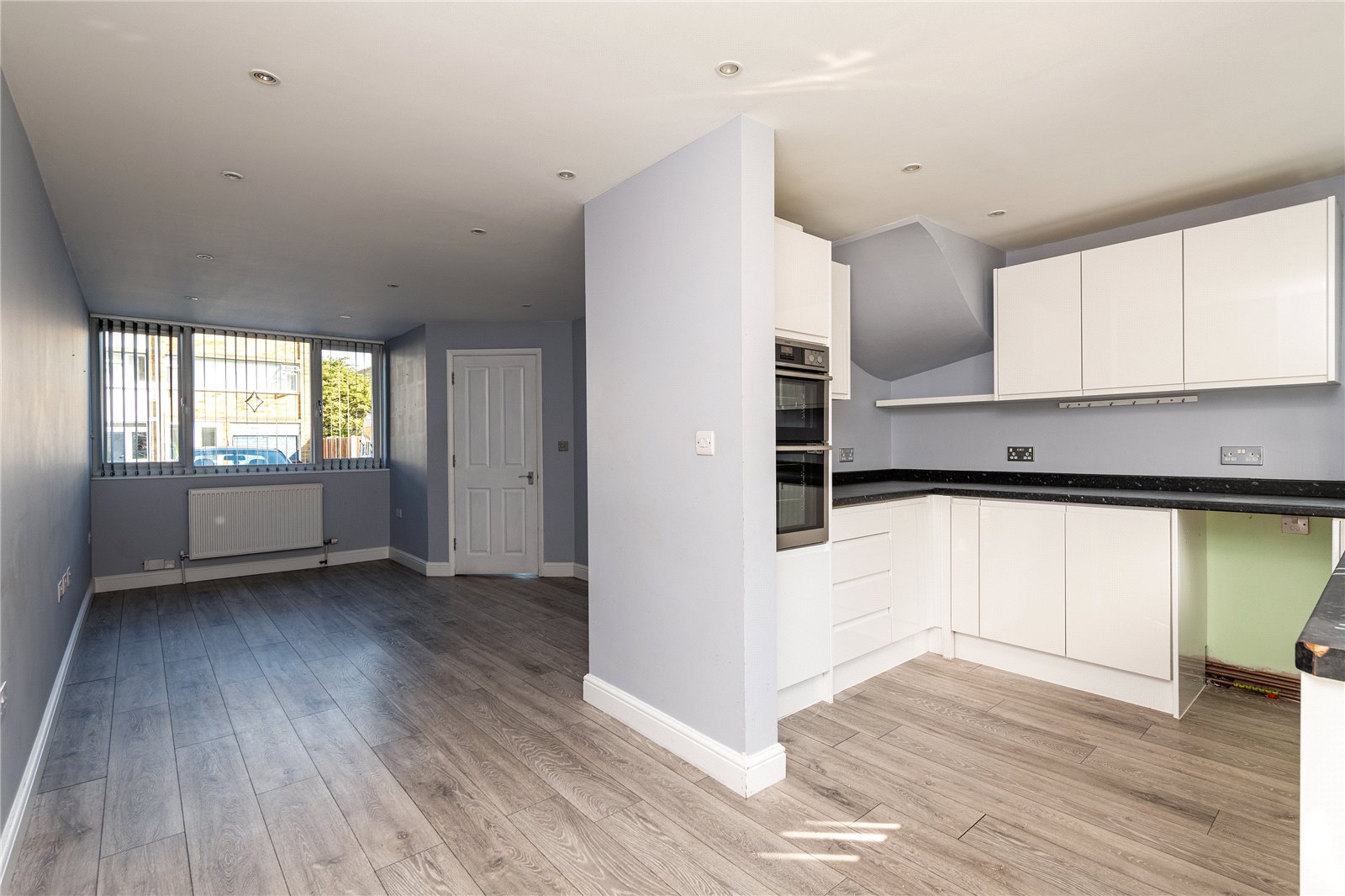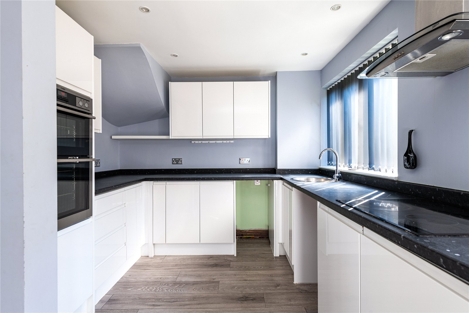 Modern kitchen/dining room with white high-gloss units, electric double oven and hob, and space/plumbing for a washing machine and fridge freezer