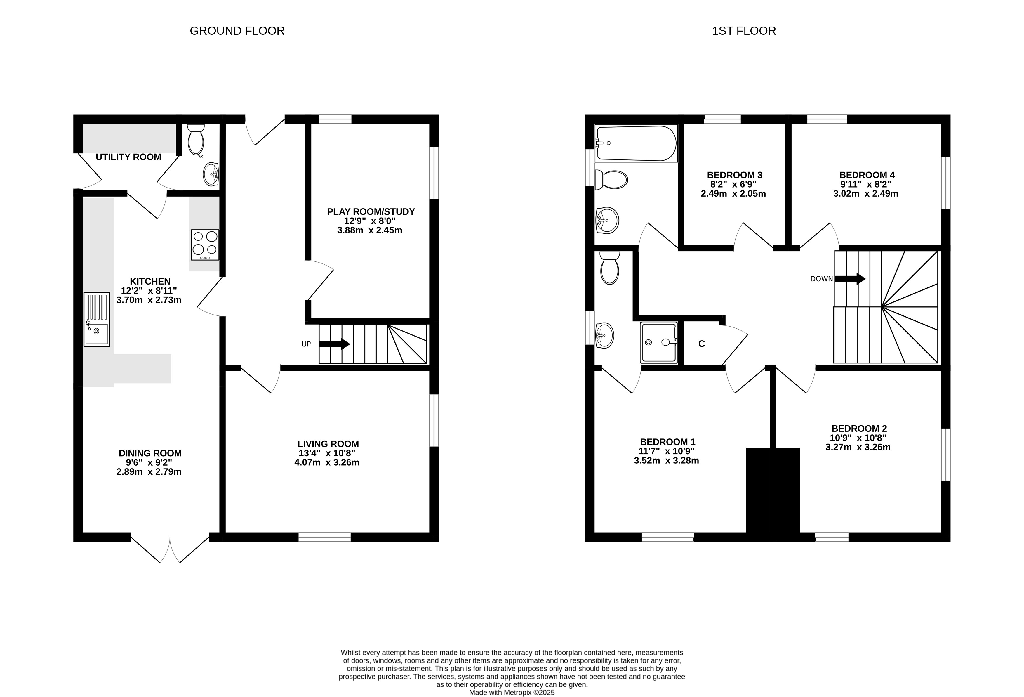 This detached four bedroom family home ticks all the boxes! Entering in through the entrance hallway, there is a good sized study/play area. Following on you have a good size living area and open plan dining/kitchen area which includes an integrated fridge/freezer, dishwasher, oven and hob. You have a very useful utility area with plumbing for washing machine and tumble dryer and downstairs W/C also. Upstairs you have three double bedrooms, one with an en-suite and two with built in storage, there is also one single bedroom and family bathroom.
